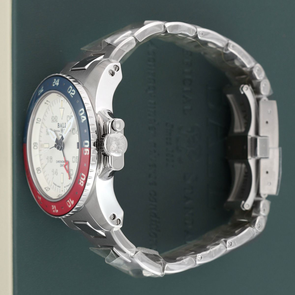 Case: Brushed & polished stainless steel case. Patented crown protector with push-button swivel bar. Stainless steel bi-directional bezel featuring a sapphire crystal capped 24 hour blue & red aluminum insert with gas tubes luminosity. Silvered meteorite stone dial, each dial is unique. Black & white time related hands. Applied index hour markers. Fine printed minutes/seconds track. Date windows at 3 o'clock.