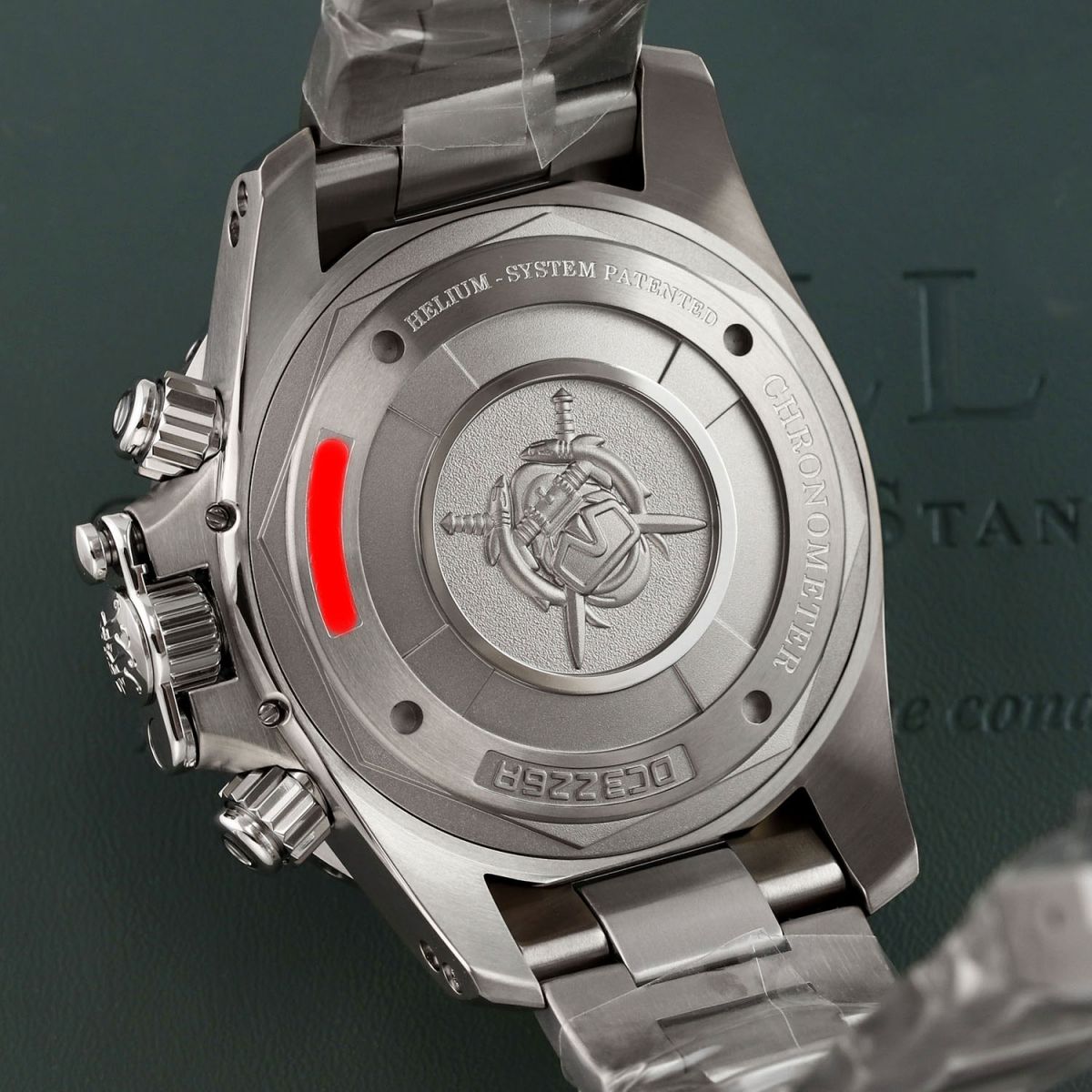 Case: Brushed & polished titanium case. Patented crown protector with push-button swivel bar. Helium escape valve. Uni-directional rotating bezel with a polished black ceramic bezel ring featuring a 60 minute diving scale. Blue dial with a fine sunray finish. Polished hands. Applied index hour markers. Fine printed minutes/seconds & fractions of a seconds tracks. Day & date windows at 3 o'clock. Small seconds sub-dial at 9 o'clock.