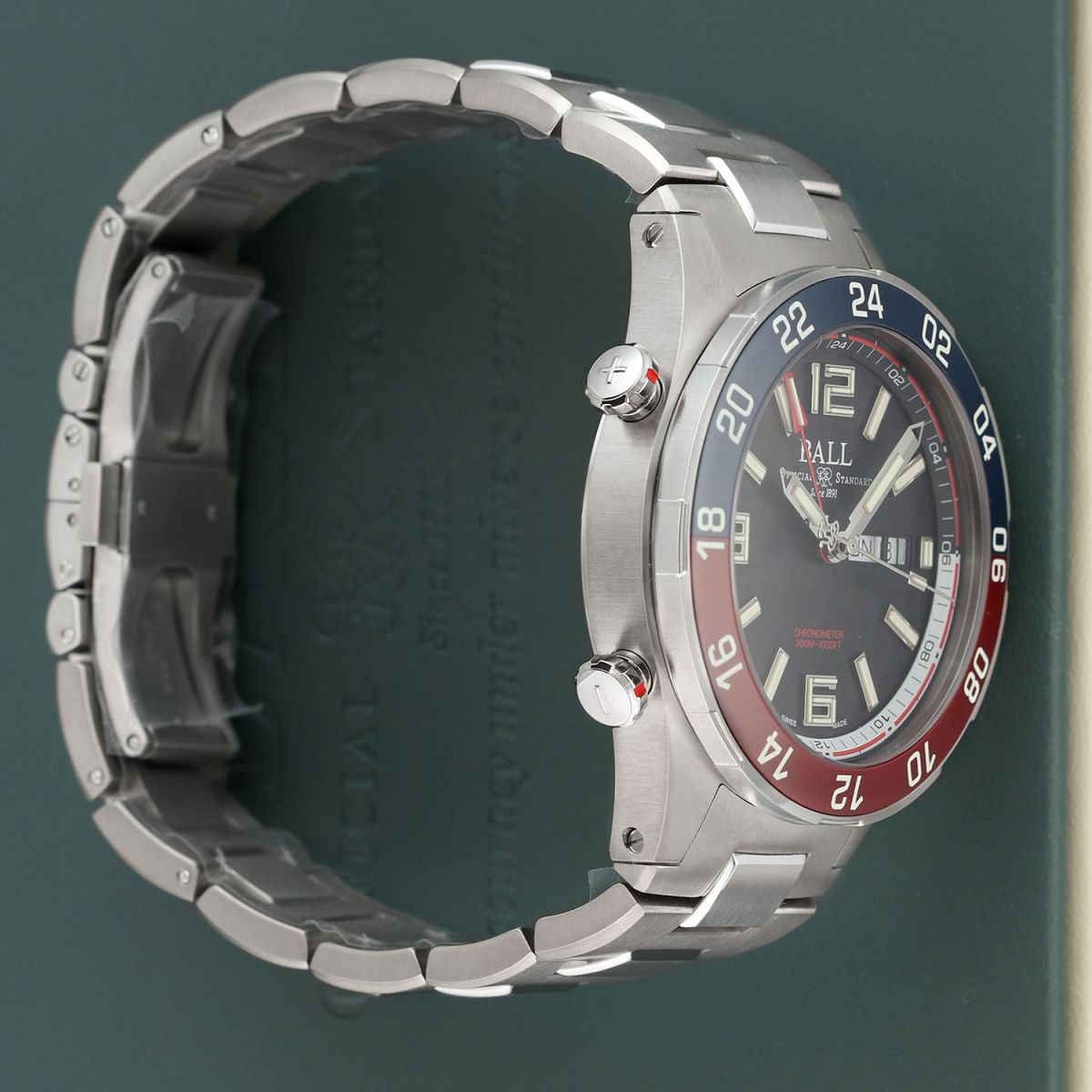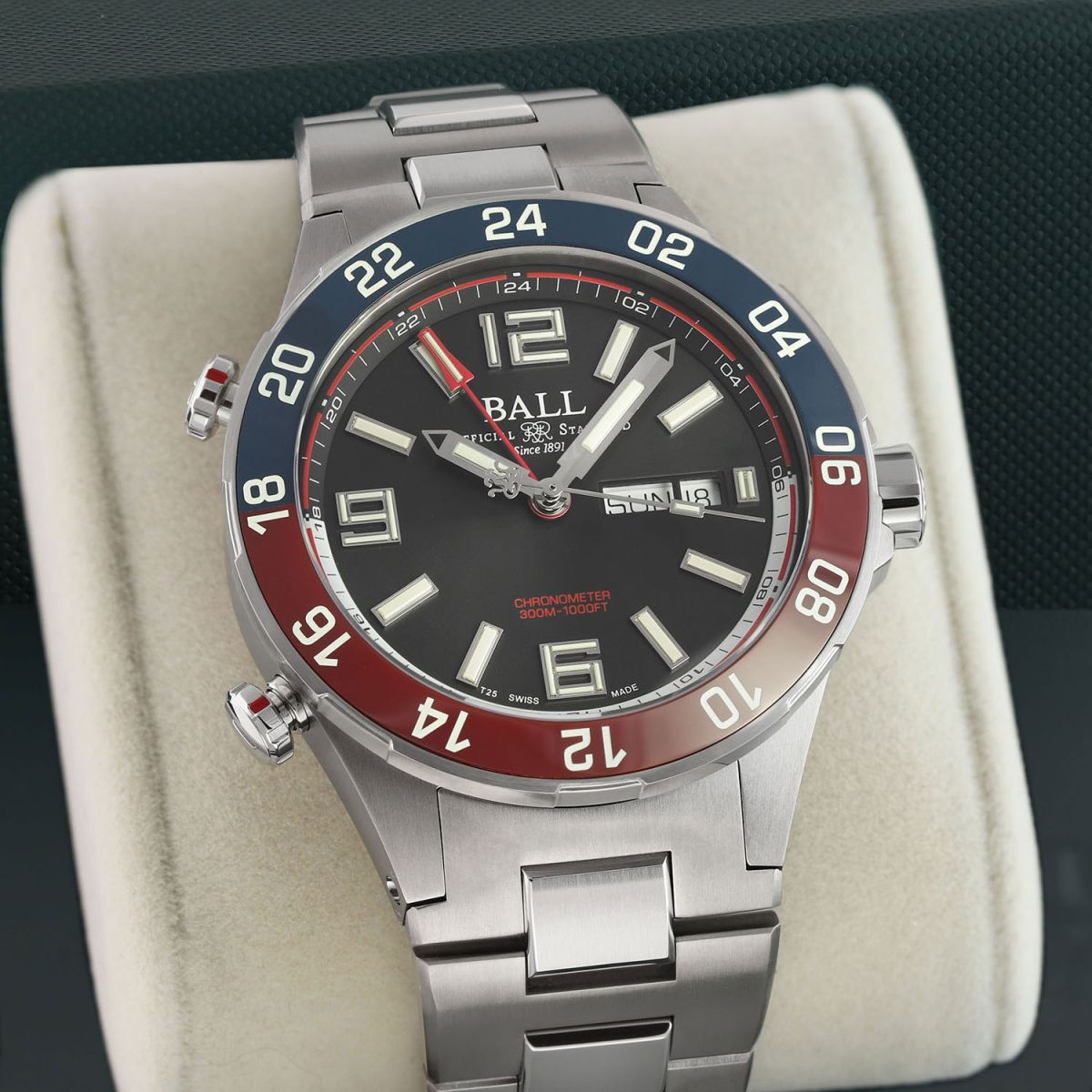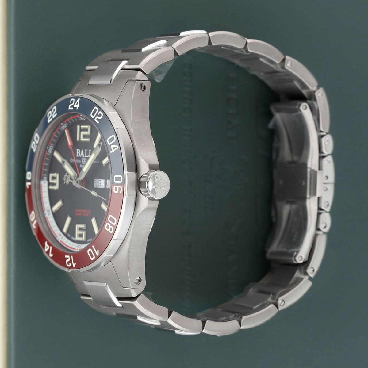 Case: Brushed & polished titanium case. Stainless steel bi-directional bezel with polished blue/red ceramic GMT bezel ring. Black dial. Polished hands. Applied index & numeral hour markers. Fine printed minutes/seconds track. Day & Date windows at 3 o'clock.