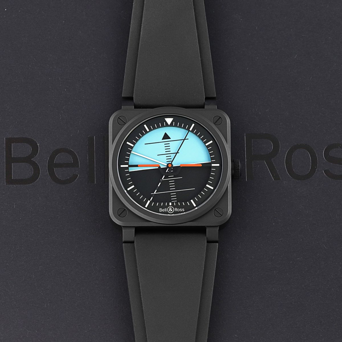 Case: Microblasted black ceramic case. Sky-blue & black rotating hour dial-disc inspired by an aircraft horizon indicator. A black printed arrow on the rotating disc indicates the hours. White luminous minute hand. Black & white checkered seconds hand. Black dial flange with luminous hour markers and a printed minutes/seconds track.