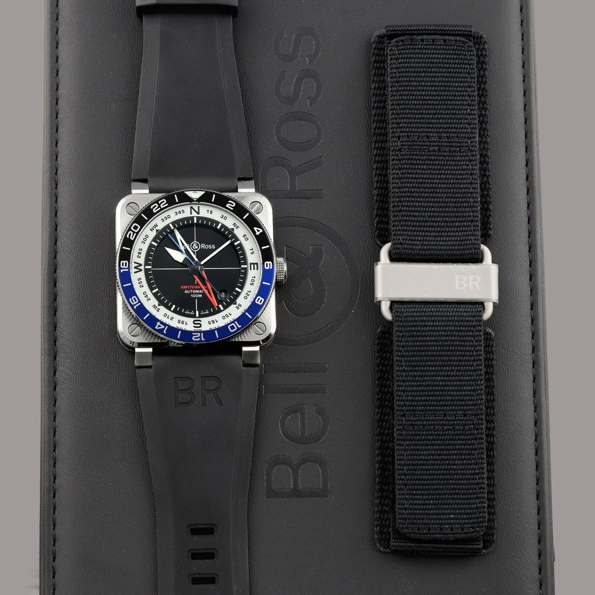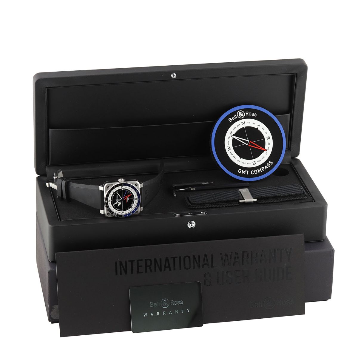 Condition: This watch is in excellent near brand new condition. The original owner claims to have worn the watch a handful of times in te very short period he owned the watch, based on the condition of the watch we believe him. We have had no reason to polish or even buff this watch, it remains with it original factory finishes. We would be comfortable grading this watch in 99% overall condition. Delivered in its original box with all papers & Bell & Ross GMT COMPASS patch.