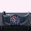 Case: Matte blue ceramic case. Blue & orange ceramic uni-directional bezel with luminous 60 minute diving scale. Blue dial. Polished hour & minute hands with luminous fill. Orange seconds hand with luminous tip. Applied polished hour markers with luminous fill. Printed minutes/seconds track on the dial flange. Date window between 4 & 5 o'clock.