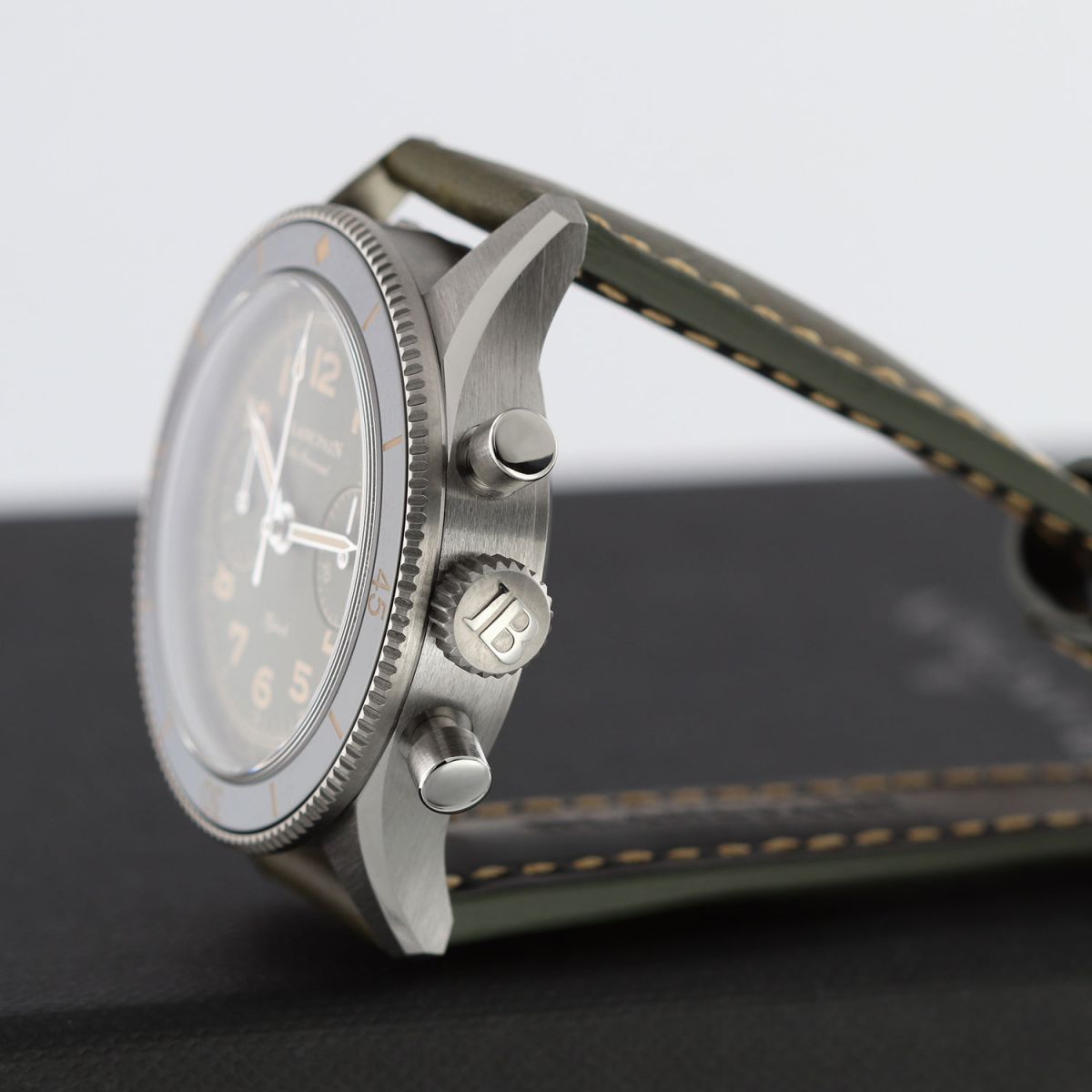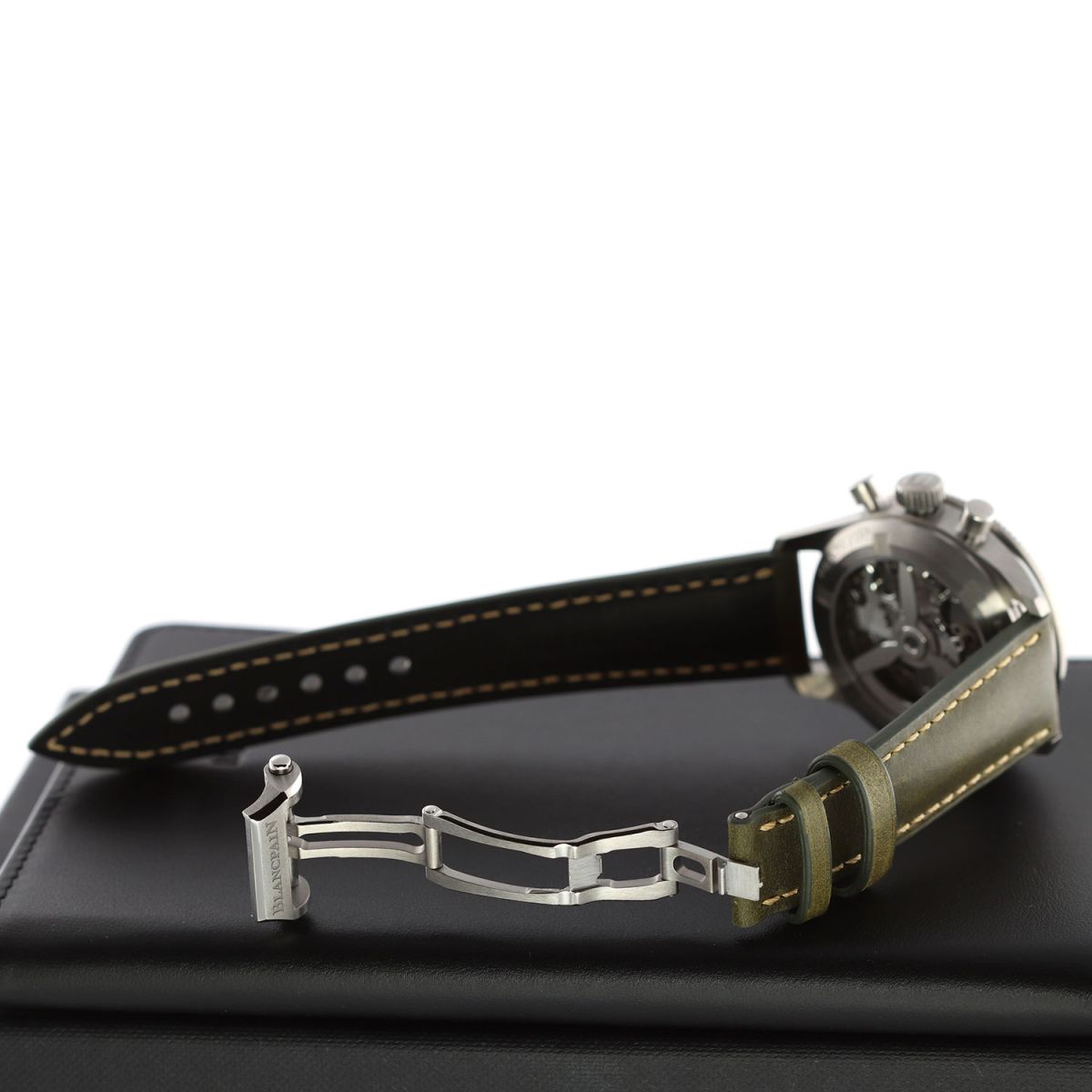 Case: Brushed titanium case. Box & domed sapphire crystal. Bi-direction rotating bezel with polished black ceramic insert & vintage colored luminous 5 minute scale. Matte green dial. Tachymeter scaled on the dial perimeter. Polished hands, central hands with vintage colored luminous fill. Vintage colored luminous numeral hour markers. Fine printed minutes/seconds & fraction of a seconds track.