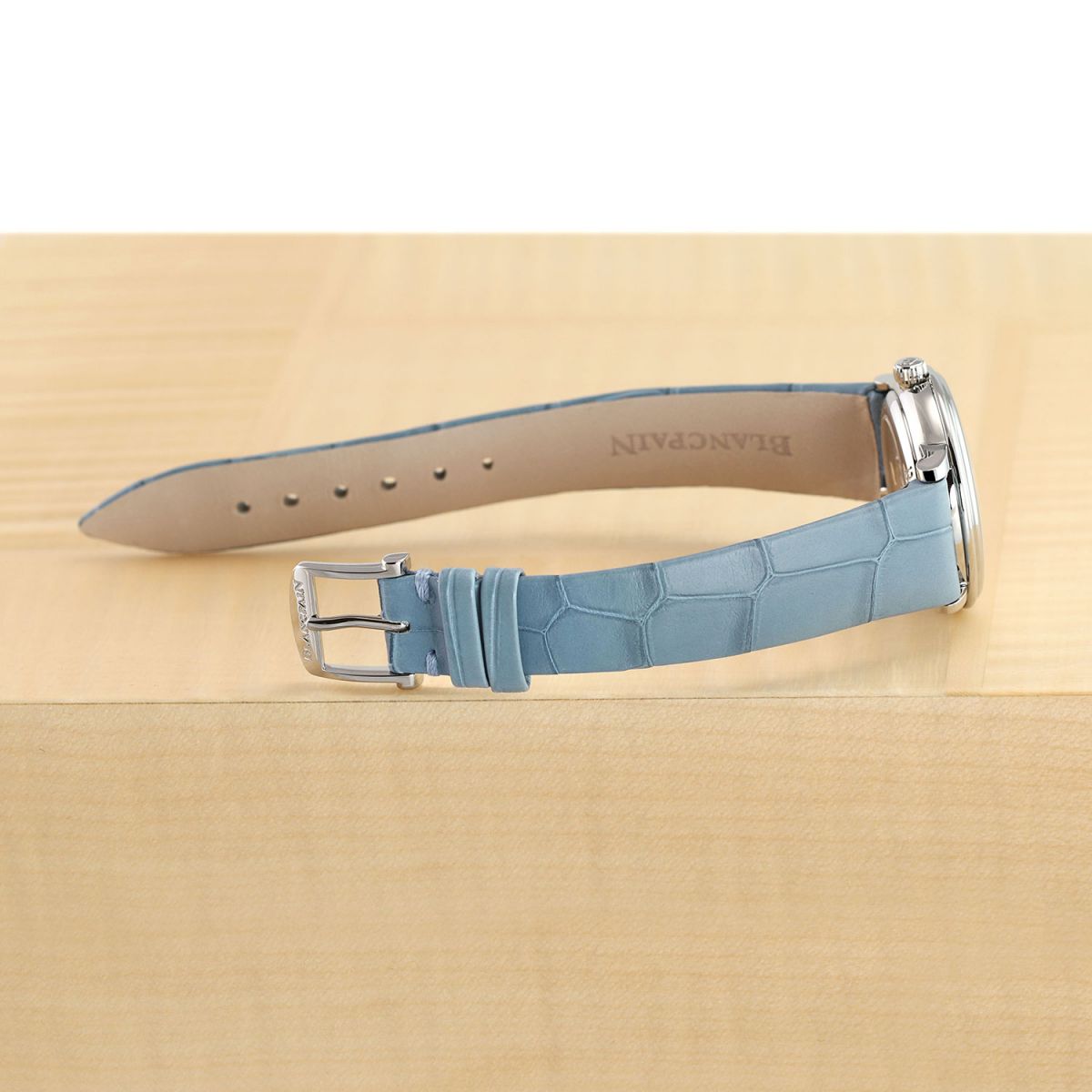 - The watch is fitted on a light blue alligator leather strap with a polished stainless steel buckle.