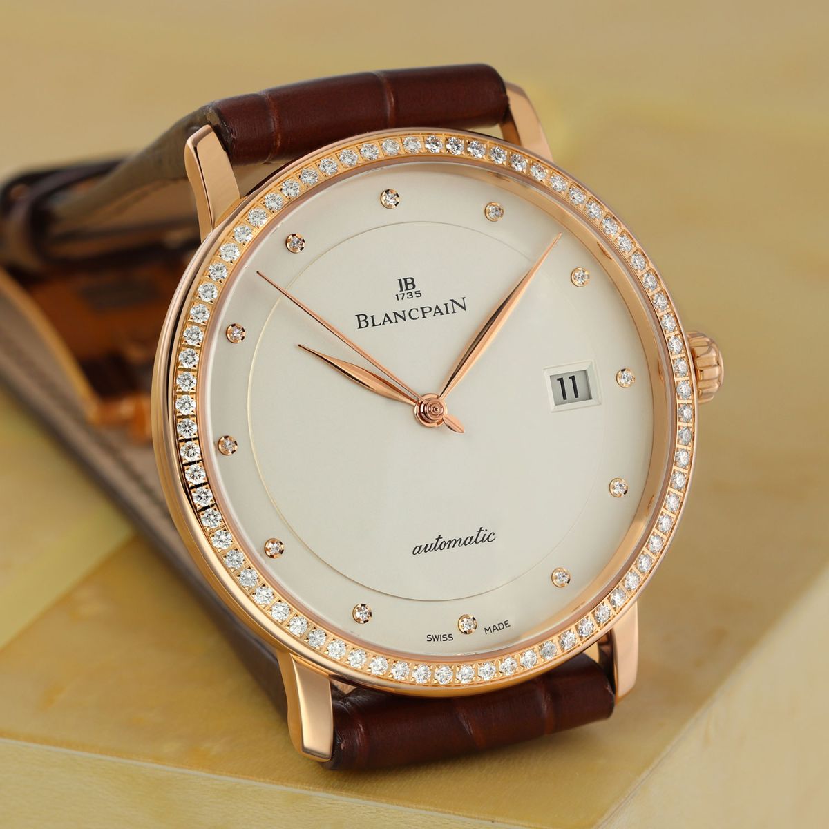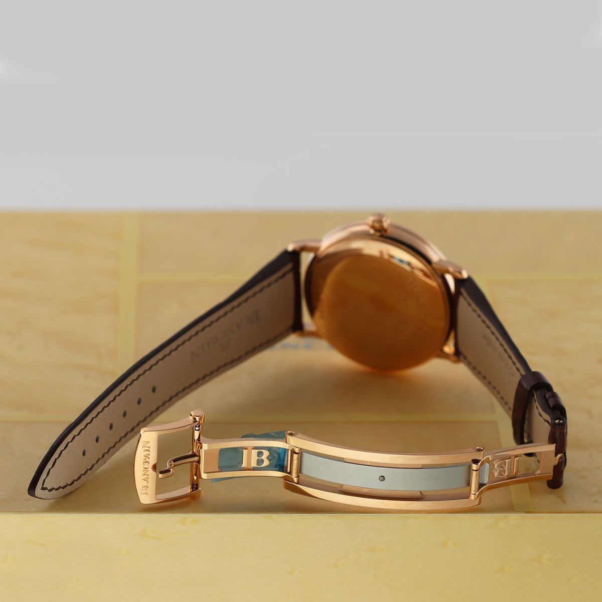 - Fitted on a Blancpain original brown alligator leather strap with a solid 18kt rose gold deployant buckle. The strap is in unworn condition with its full wear lifespan remaining.