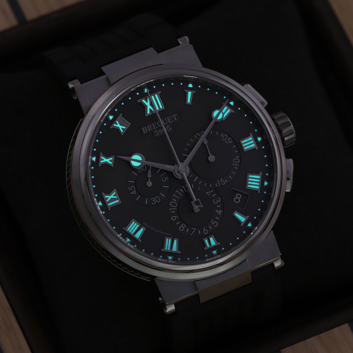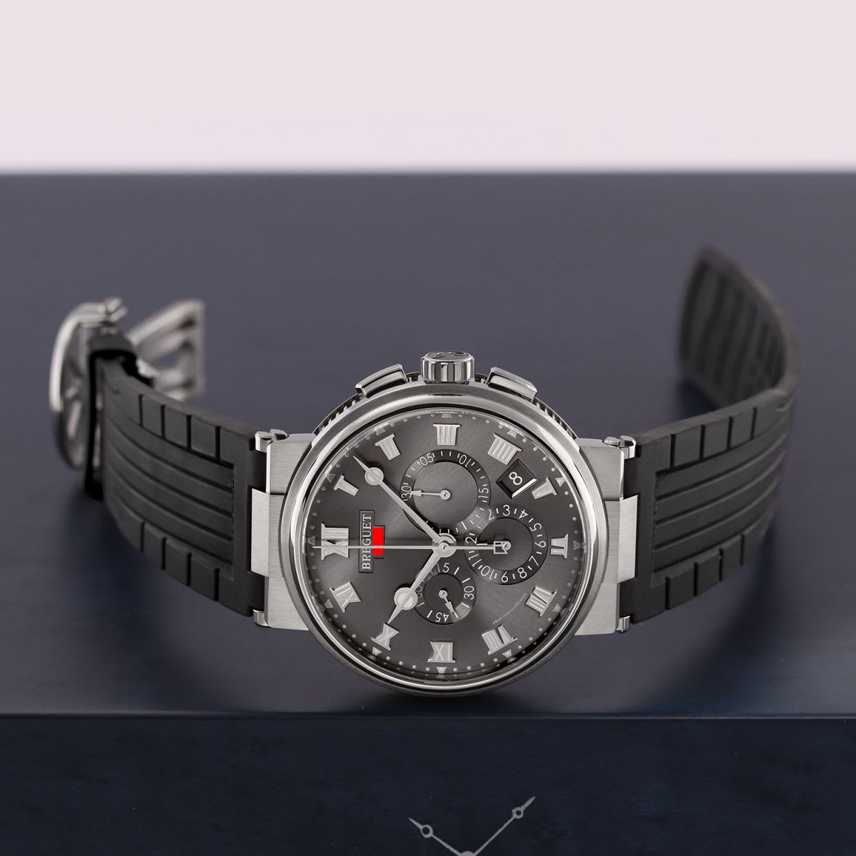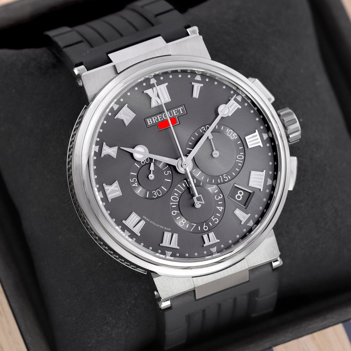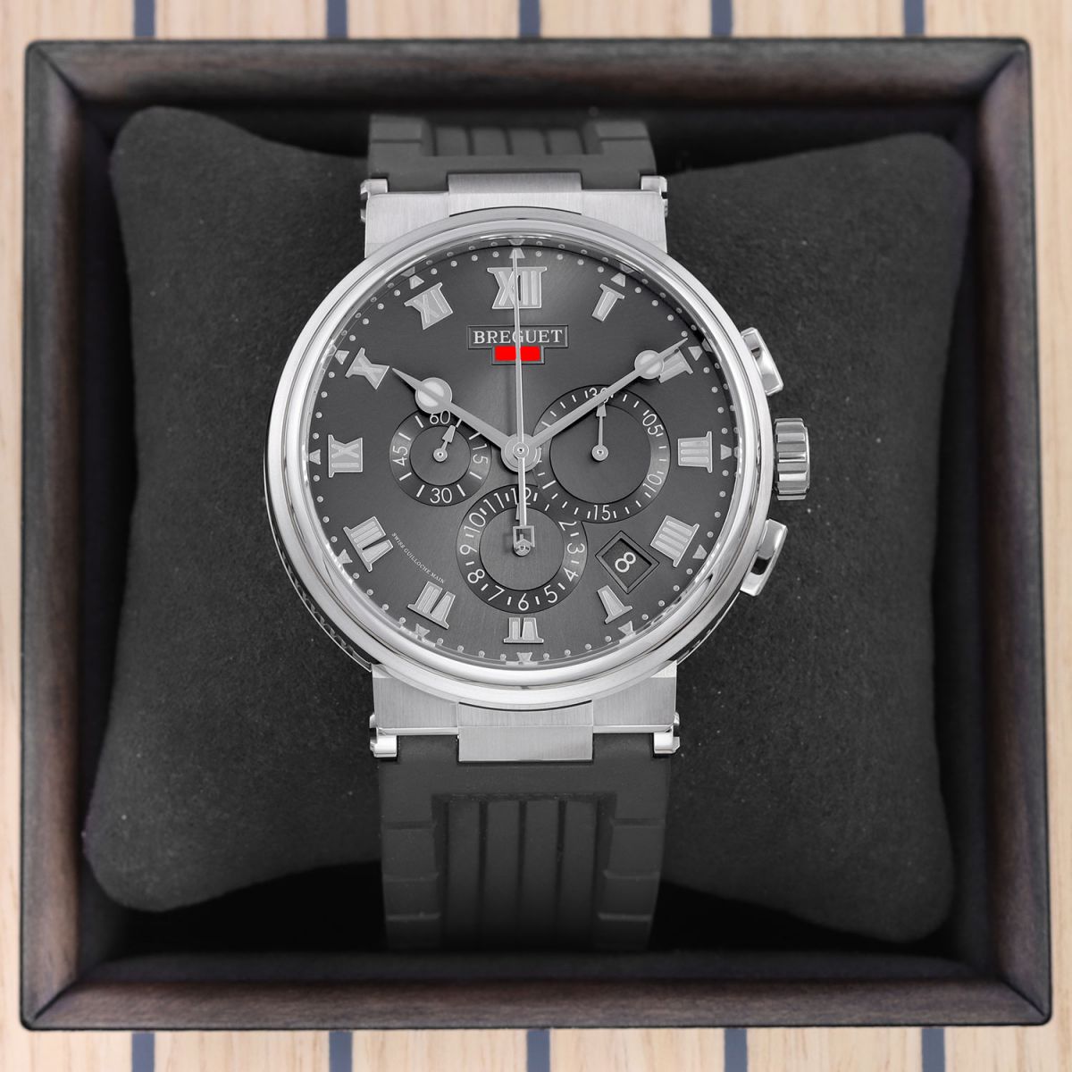 Case: Brushed & polished titanium case with Breguet's signature fluted/coined-edge case band. Grey dial with a fine sunray finish. Polished hands, the hour & minute hands with luminous filled tips. Applied polished Roman numeral hour markers with luminous fill. Luminous dot minute/seconds track. Date window between 4 & 5 o'clock. Small seconds sub-dial at 9 o'clock.