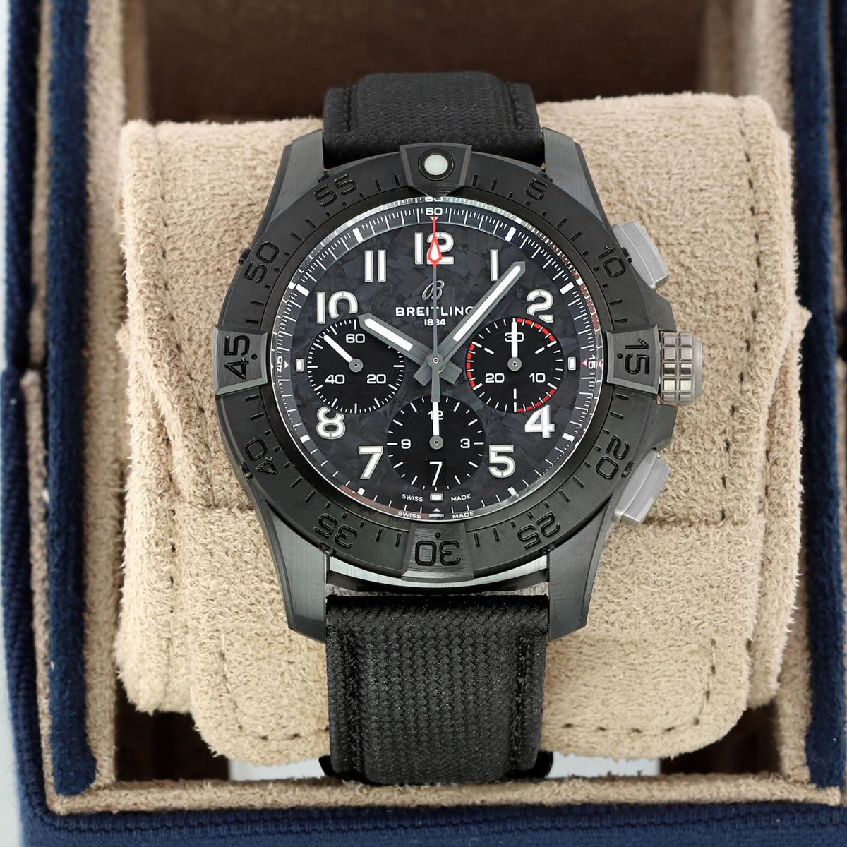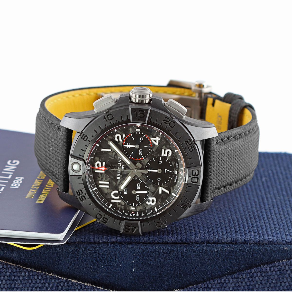 Strap: Fitted on its original Breitling black calfskin leather strap with a titanium push-button deployant buckle. The strap was worn a handful of times only, it is in excellent condition with its full wear lifespan remaining. We would be comfortable rating the strap as in 99% overall condition.
