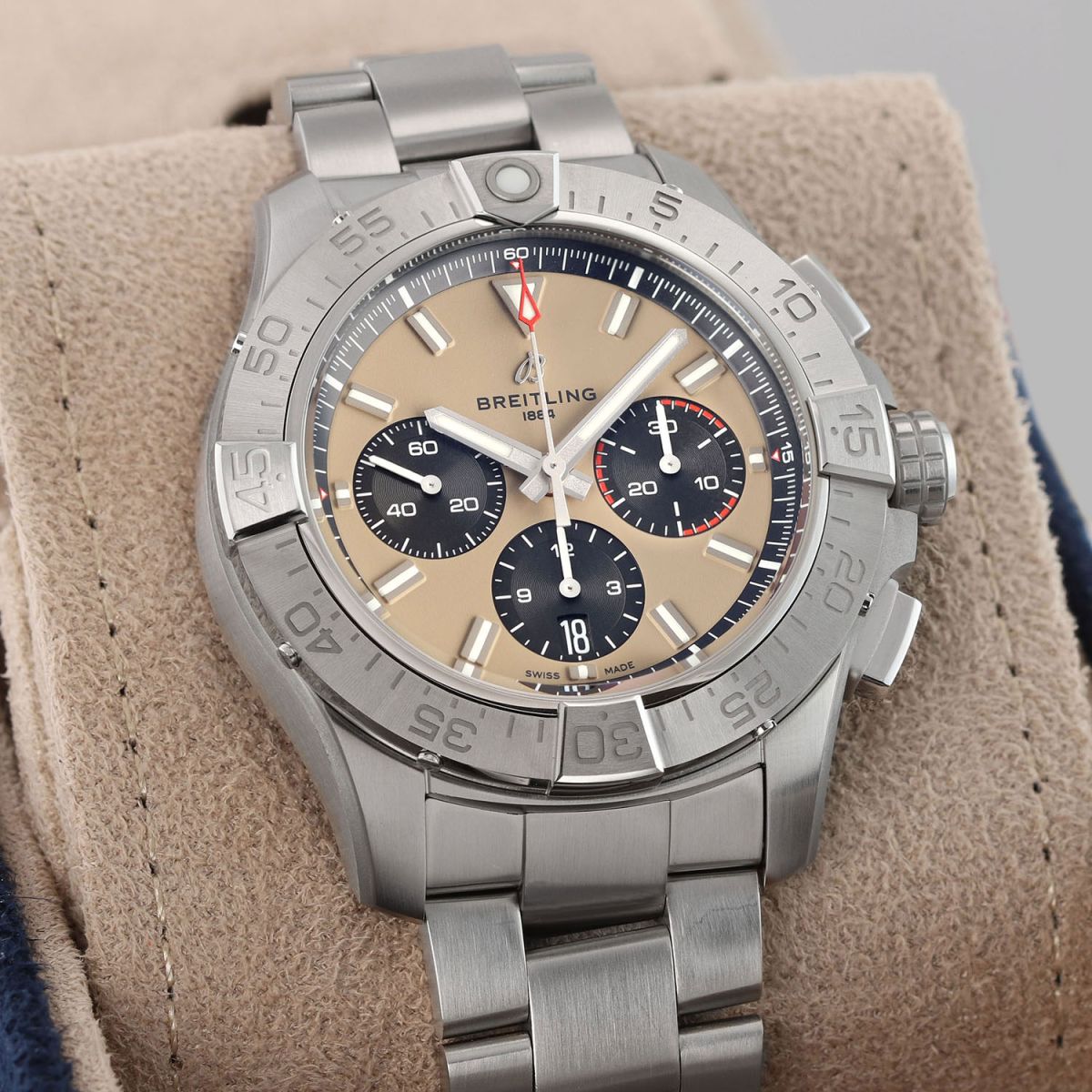 Case: Brushed stainless steel case and bezel. Brushed & polished stainless steel bezel with engraved minutes/seconds track & raised 15 minute tabs. Sand-beige colored main dial, black sub-dials and dial flange. Matte & polished faceted hour & minute hands with luminous fill. White central seconds & sub-dial hands. hands with luminous fill. Applied hour markers with luminous fill. Fine printed minute/seconds & fractions of a seconds track on the dial flange. Date window at 6 o'clock. Small seconds sub-dial at 9 o'clock.