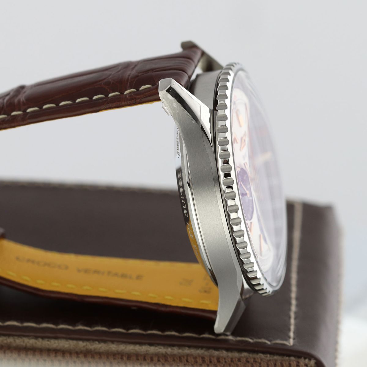 Case: Brushed & polished stainless steel case. Bi-directional rotating bezel with slide-rule. The circular slide-rule allows pilots to perform necessary flight calculations. Silvery off-white dial. Black sub-dials & dial flange. Features the AOPA wings gold logo in polished rose at 12 o'clock. Polished rose gold hands, the hour & minute hands with luminous fill. Applied polished rose gold polished index hour markers with luminous tips. Fine printed minutes/seconds & fractions of a second track. Small seconds sub-dial at 9 o'clock. Date window at 6 o'clock.