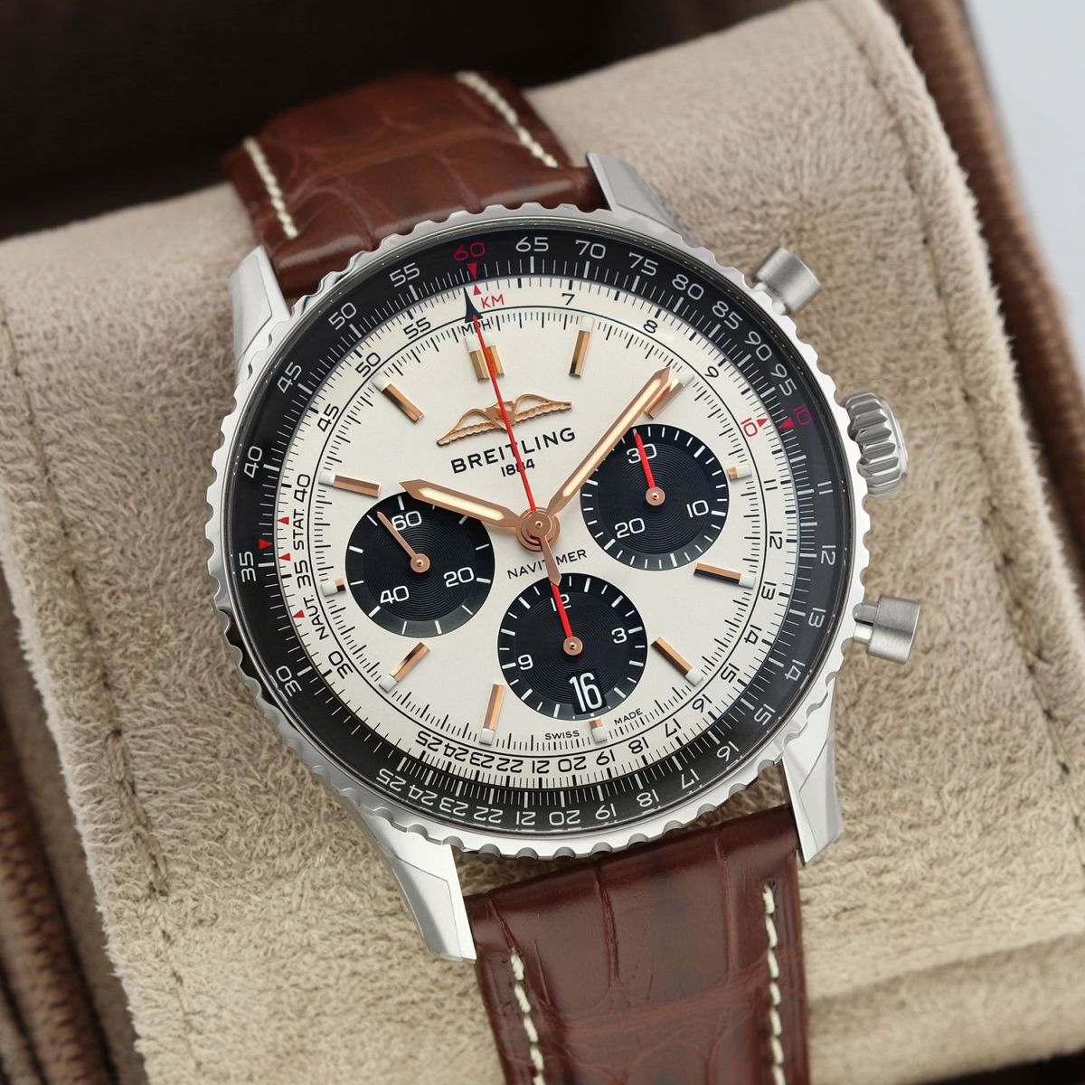 - Delivered with an additional original Breitling brown calfskin leather strap with double saddle stitching in red & orange. The strap is brand new & unworn with its full wear lifespan remaining.