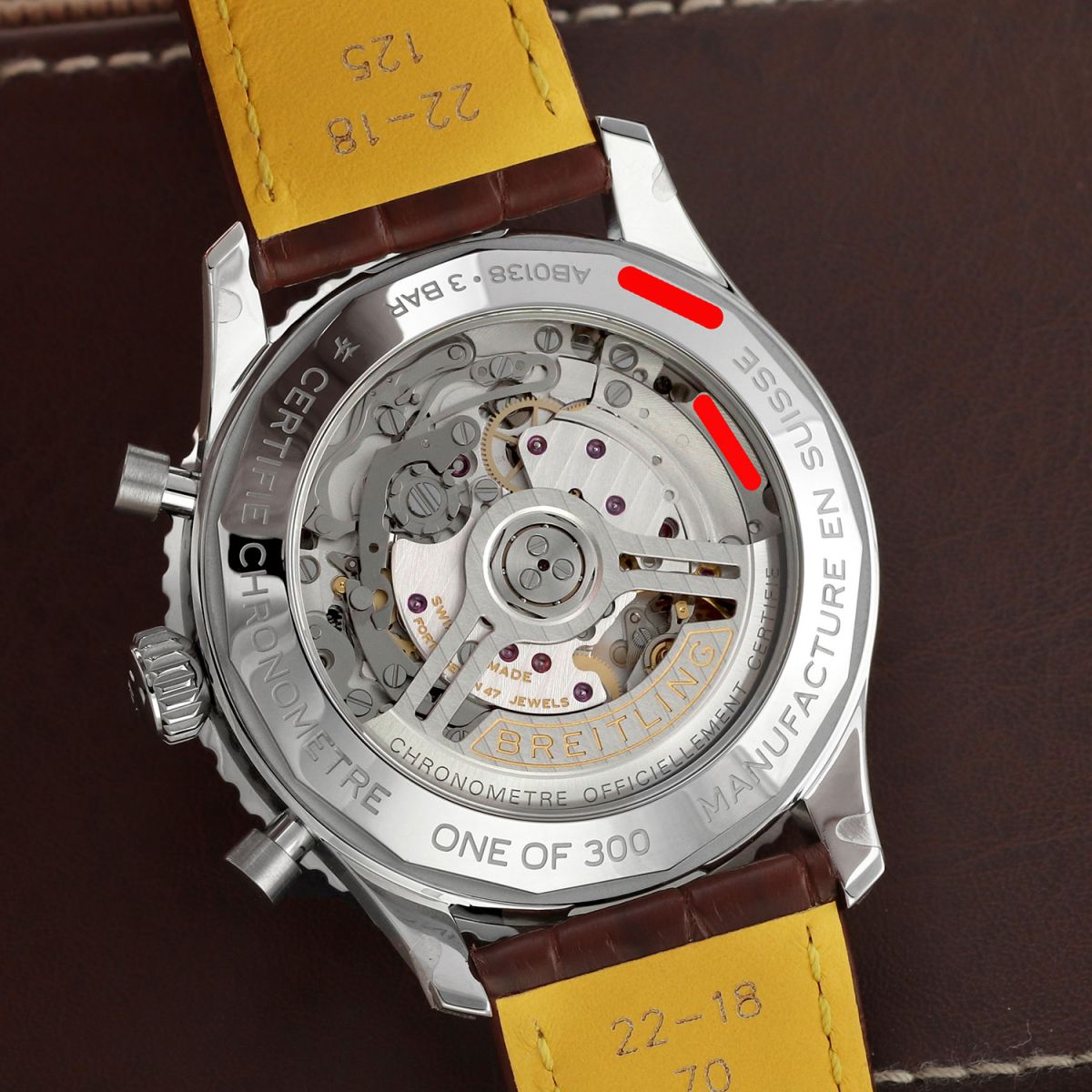 Movement: Powered by a Breitling in-house caliber 01, which beats at 28,000 vph (4Hz), contains 47 jewels, and has a power reserve of +/- 70 hours.