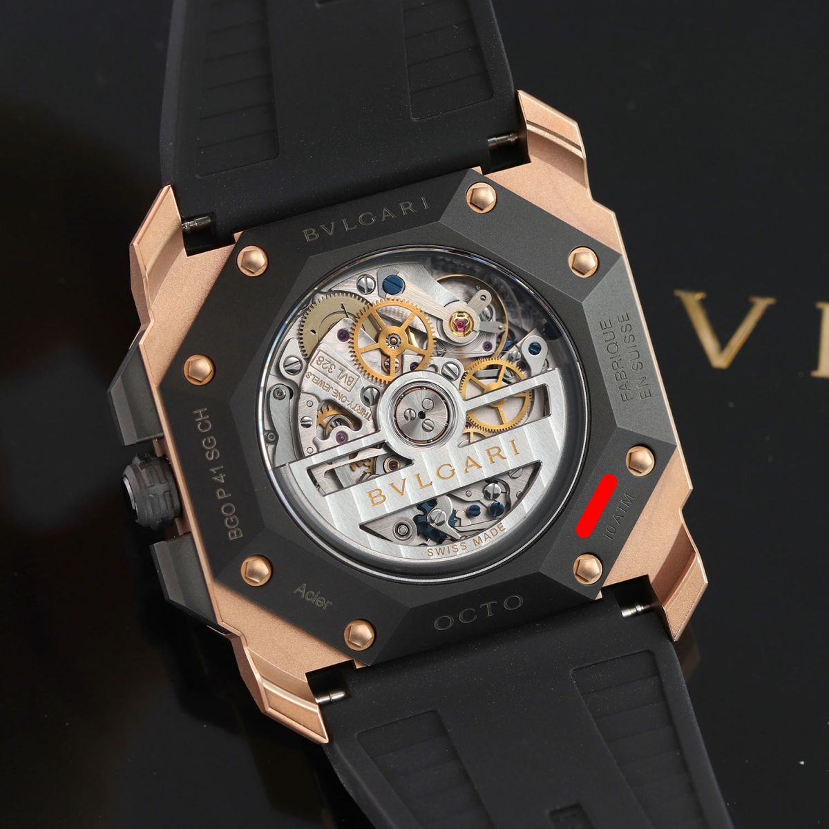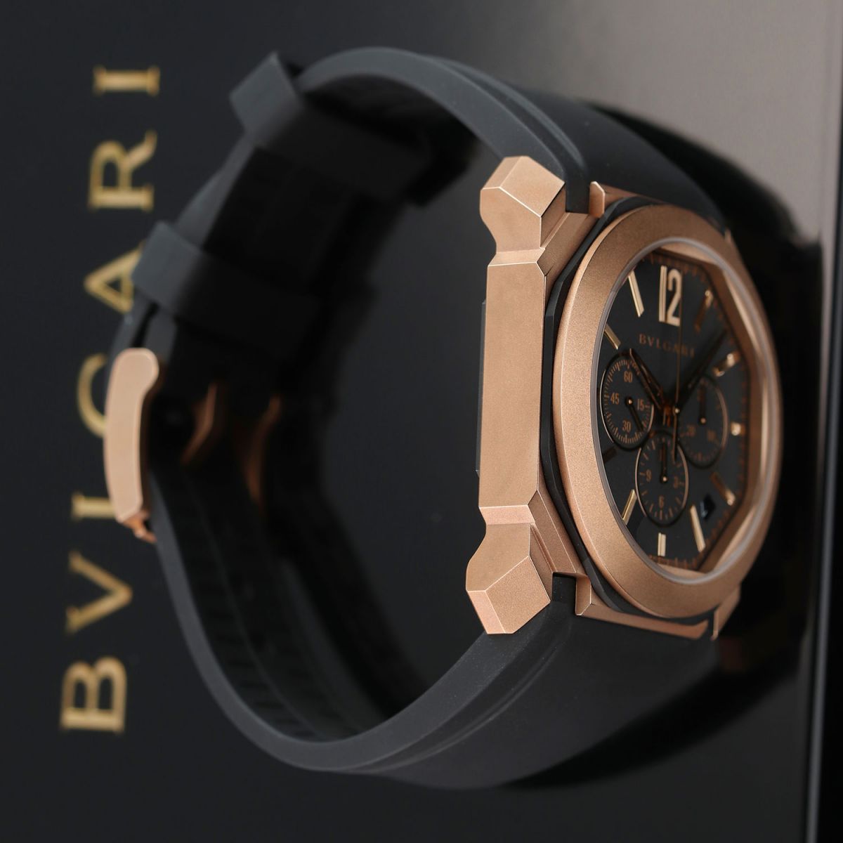 Strap: Fitted on its original Bulgari black rubber strap with a solid 18kt rose gold tang buckle. The strap is unworn & in perfect new condition.