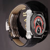Case: Brushed & polished stainless steel case. Black ceramic bezel ring. Crown set with polished black onyx cabochon. Black enameled dial with red enameled sub-dial accents. Polished hands.