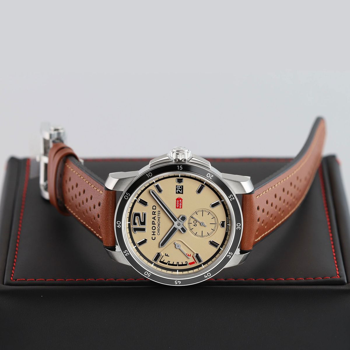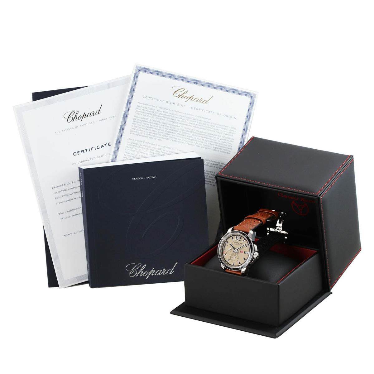 Strap: Fitted on its original Chopard tan brown perforated calfskin strap with a tire tread designed rubber lining and with a stainless steel push-button deployant buckle. The strap is brand new, crisp & unworn with its full wear lifespan remaining.