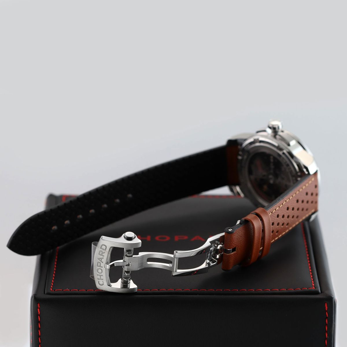 Movement: Powered by a Chopard in-house caliber 01.02-M, COSC certified Chronometer, beats at 28,800 vph (4Hz) contains 36 jewels & has a power reserve of +/- 60 hours. Features a unique open-worked bridge design, offering an engaging view into the movement’s inner mechanics.