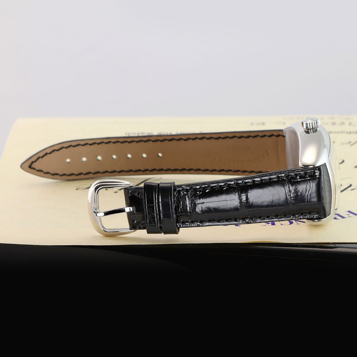 Case: Polished solid 950 platinum case. Silver dial with a fine guilloche sunburst texture pattern. Black painted numeral hour markers. Blued steel hands.