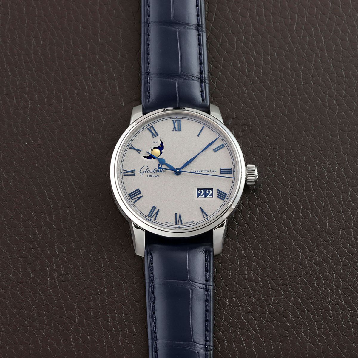 Strap: Fitted on its original Glashutte Original blue alligator leather strap with a stainless steel deployant buckle. The strap is unworn, in new condition with its full wear lifespan remaining.
