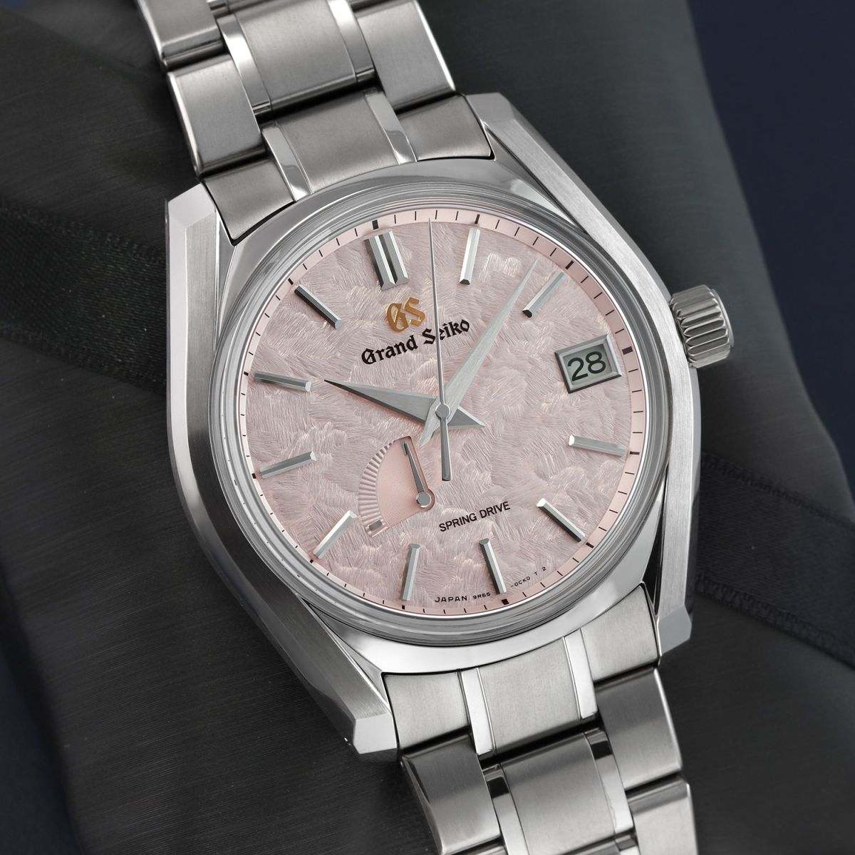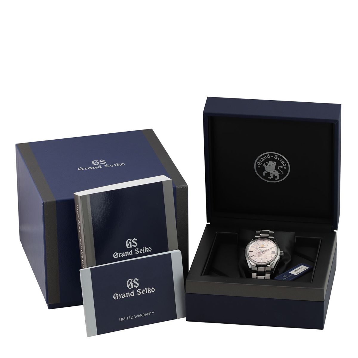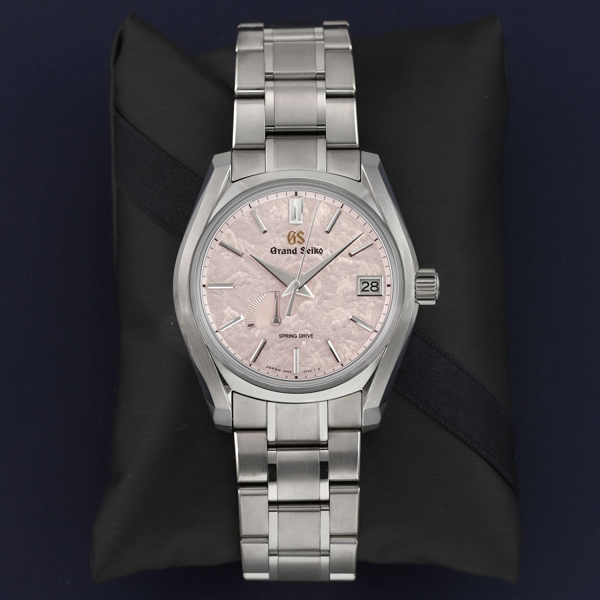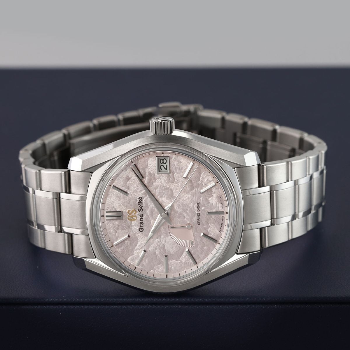 Case: Brushed & polished titanium case. The dial features Grand Seiko's very unique soft silvery pink dial with a patterned finish texture. The dial color ranges from silver with a hint of pink to a mild pink color depending on the angle & lighting. Faceted brushed & polished hour & minute hands. Polished central seconds hands. Applied brushed & polished faceted index hour markers. Fine printed minute/seconds track on the dial flange. Date window at 3 o'clock.
