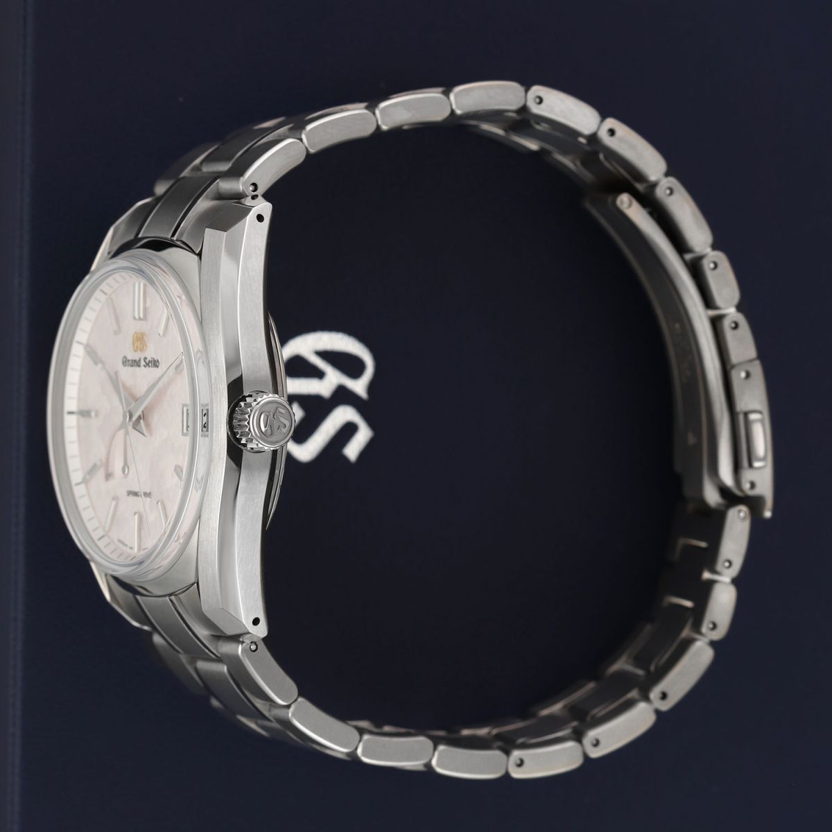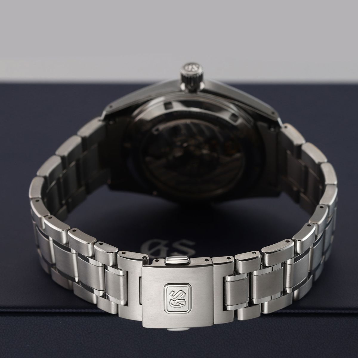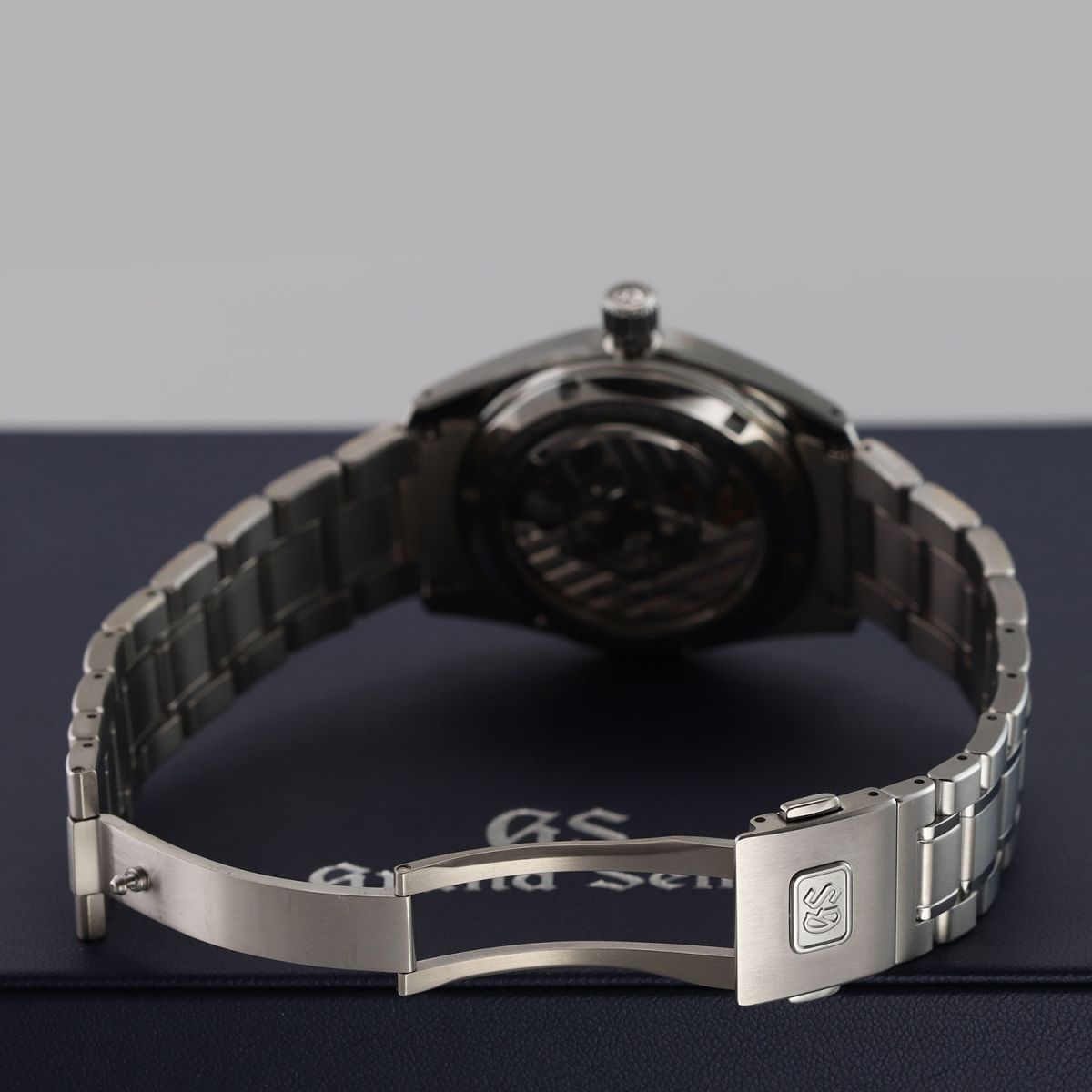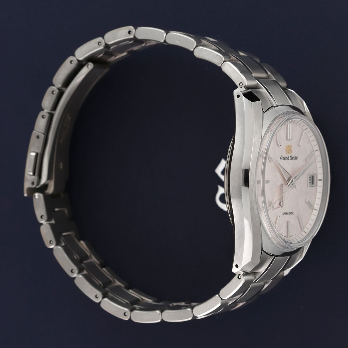 Case: Brushed & polished titanium case. The dial features Grand Seiko's very unique soft silvery pink dial with a patterned finish texture. The dial color ranges from silver with a hint of pink to a mild pink color depending on the angle & lighting. Faceted brushed & polished hour & minute hands. Polished central seconds hands. Applied brushed & polished faceted index hour markers. Fine printed minute/seconds track on the dial flange. Date window at 3 o'clock.