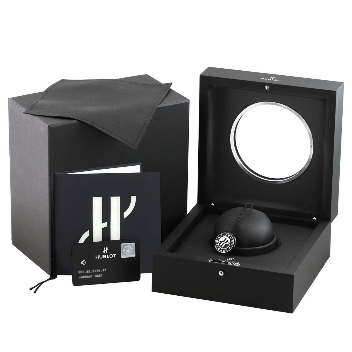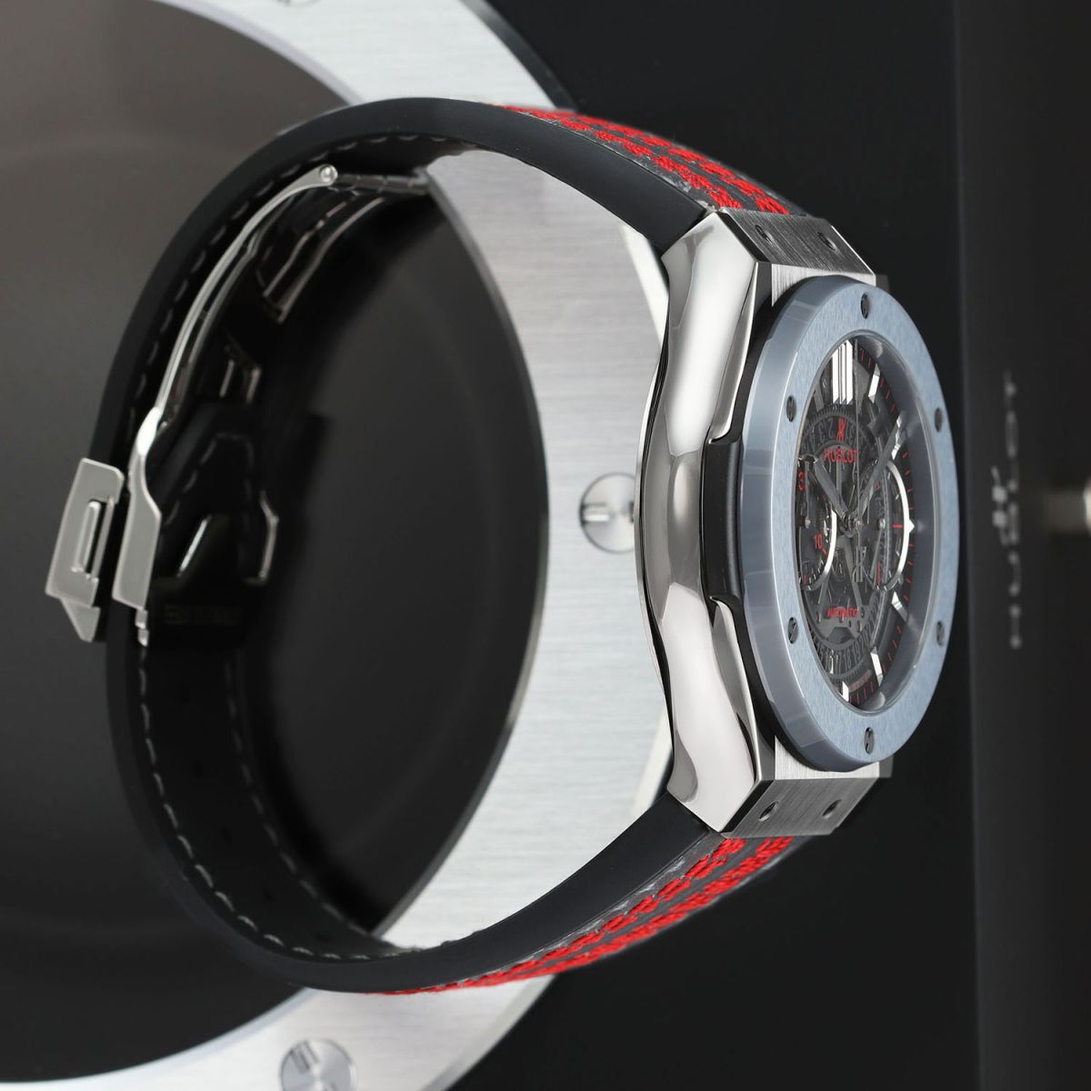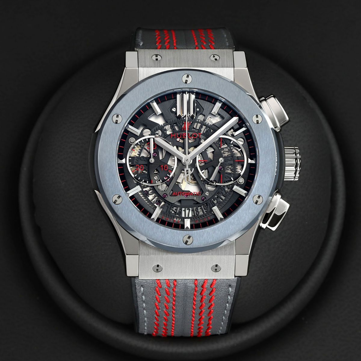 Strap: Fitted on its original Hublot grey calfskin leather top and black rubber lining strap featuring triple saddle cricket ball stitching in red and with a push-button titanium deployant buckle. The strap is new & unworn with its full wear lifespan remaining.