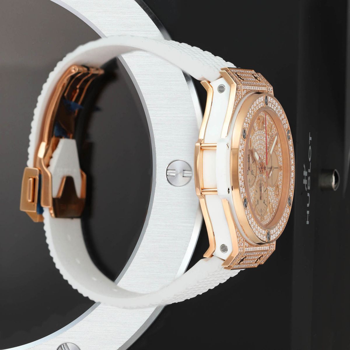 Strap: Fitted on its original Hublot white rubber strap with a push-button solid 18kt rose gold push-button deployant buckle. The strap is brand new & unworn with its full wear lifespan remaining.