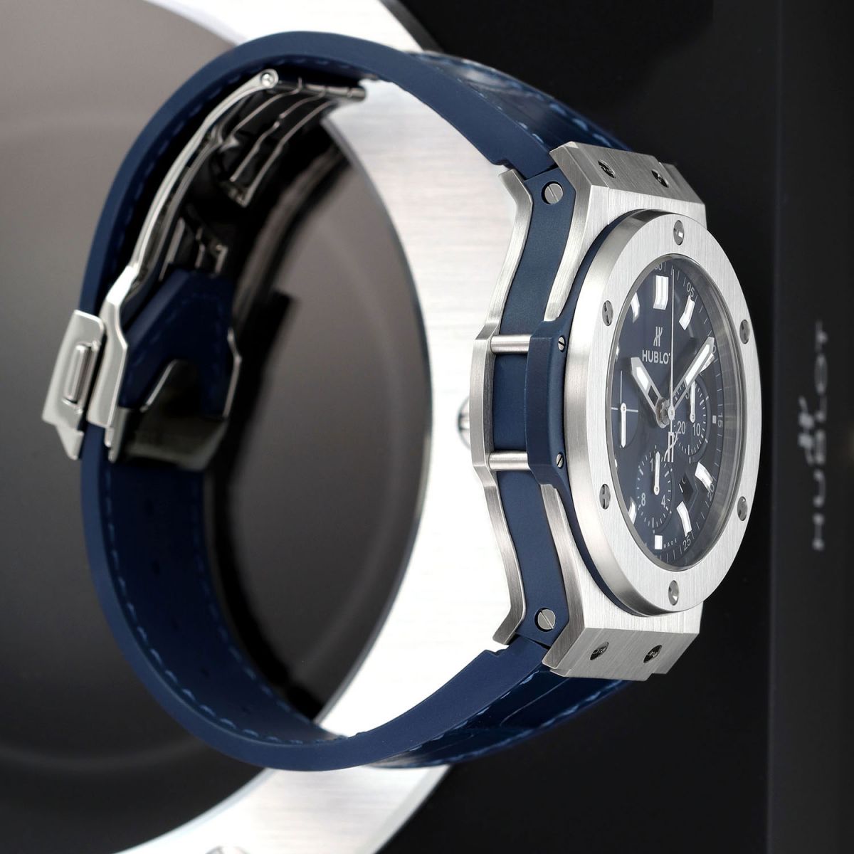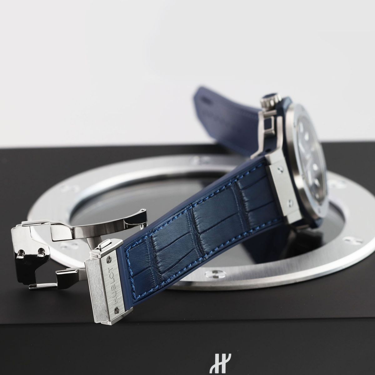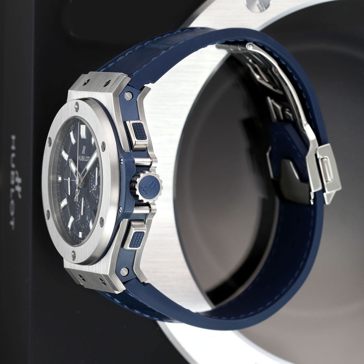 Strap: Fitted on its original Hublot blue gummy-alligator strap (alligator leather top & rubber lining) with a stainless steel push-button deployant clasp. The strap is new & unworn with its full wear lifespan remaining.