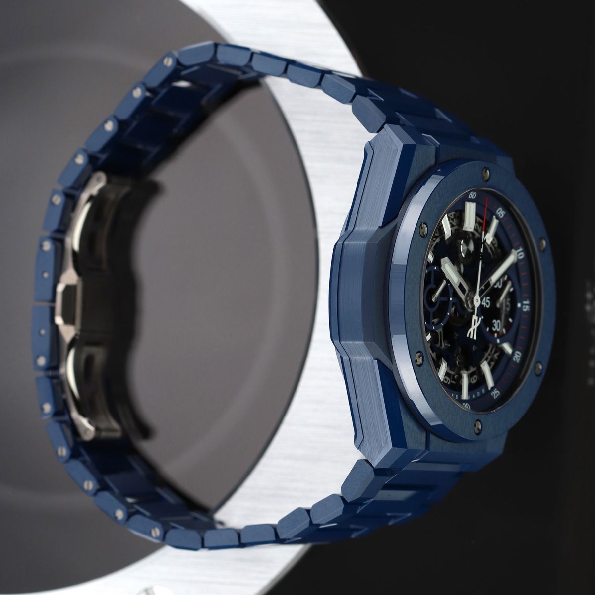 Case: Brushed & polished blue ceramic case & bezel. The bezel is secured with 6 H-shaped titanium screws. Titanium crown & chrono buttons with blue rubber grips. Transparent sapphire crystal dial showcasing the movement. Brushed hands with luminous fill. Applied index hour markers with luminous fill. Blue dial flange & sub-dial rings with minutes/seconds tracks in red & white. Skeletonized date wheel, the current date highlighted with a blue background at 3 o'clock. Small seconds sub-dial at 9 o'clock.