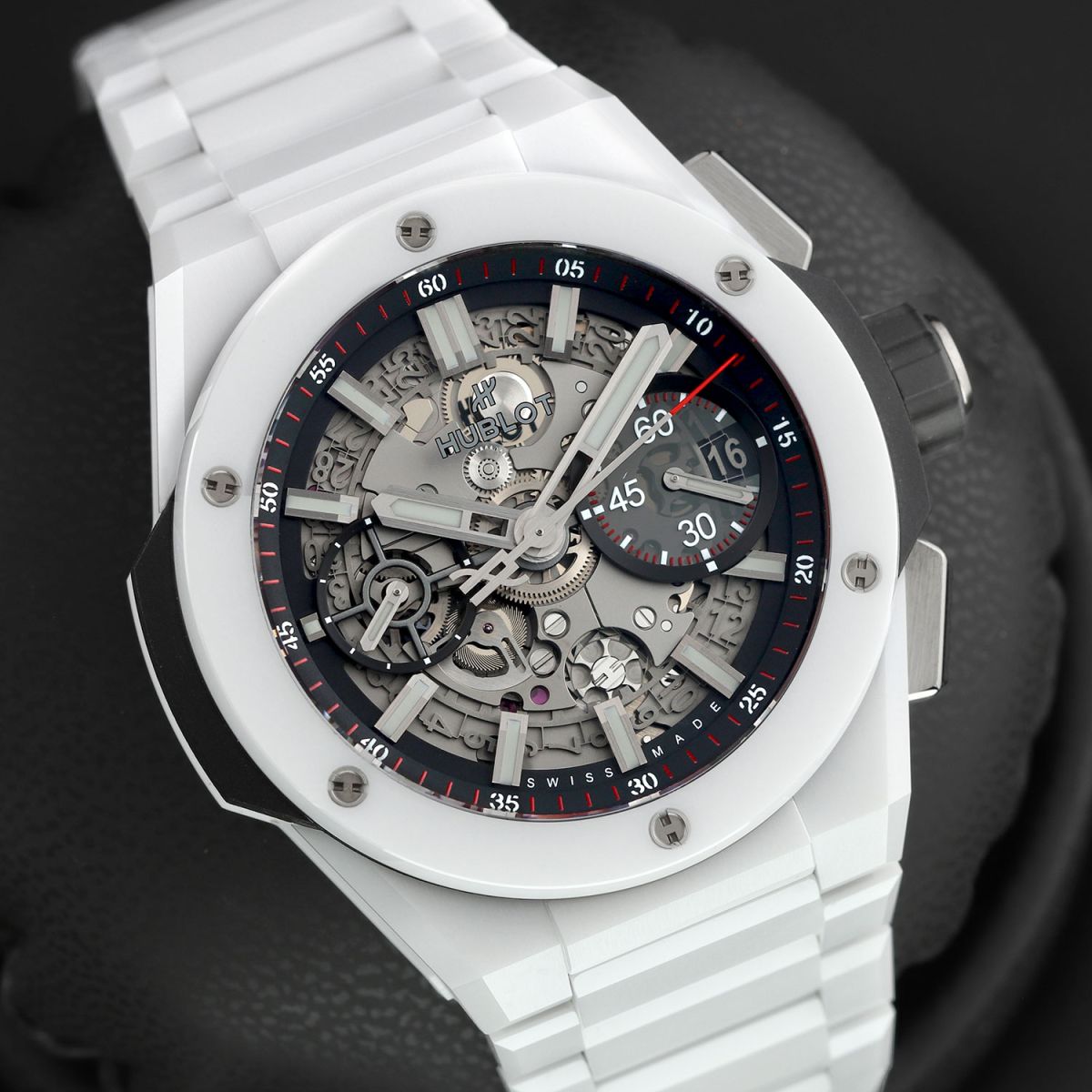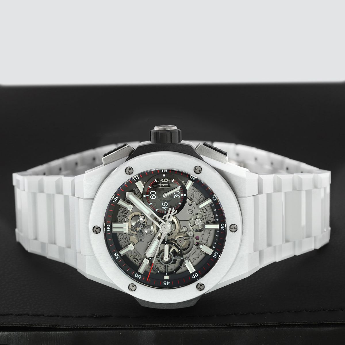 Case: Brushed & polished white ceramic case & bezel. The bezel is secured with 6 H-shaped titanium screws. Titanium crown & chrono buttons with black rubber grips. Transparent sapphire crystal dial showcasing the movement. Brushed hands with luminous fill. Applied index hour markers with luminous fill. Black dial flange & sub-dial rings with minutes/seconds tracks in red & white. Skeletonized date wheel, the current date highlighted with a black background at 3 o'clock. Small seconds sub-dial at 9 o'clock.