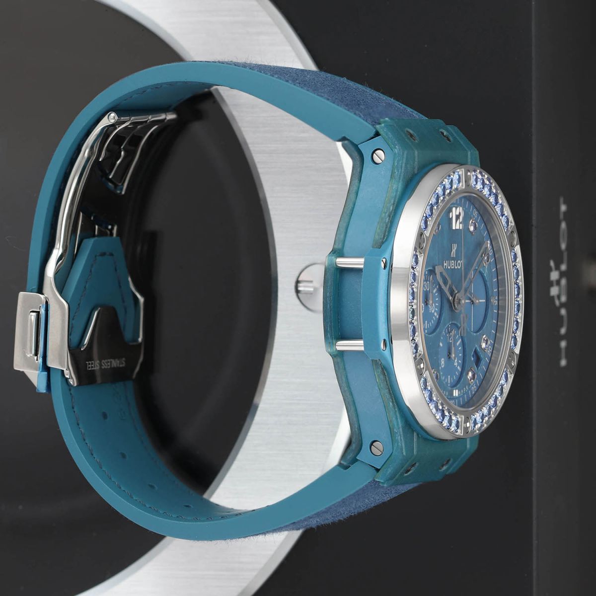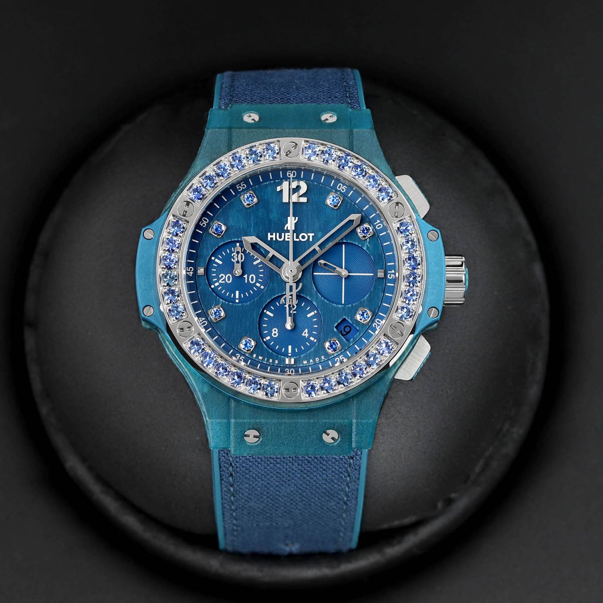 Case: Blue linen composite case. Polished stainless steel crown and pushers with blue rubber inserts. Polished titanium bezel set with 36 round-cut blue sapphires. Blue composite resin lower bezel ring and lateral inserts. Blue linen dial with vertical brushed effect. Polished hands and applied hour markers—eight of which are set with blue sapphires. Fine printed minute/seconds track. Date window between 4 and 5 o’clock. Small seconds sub-dial at 3 o’clock.