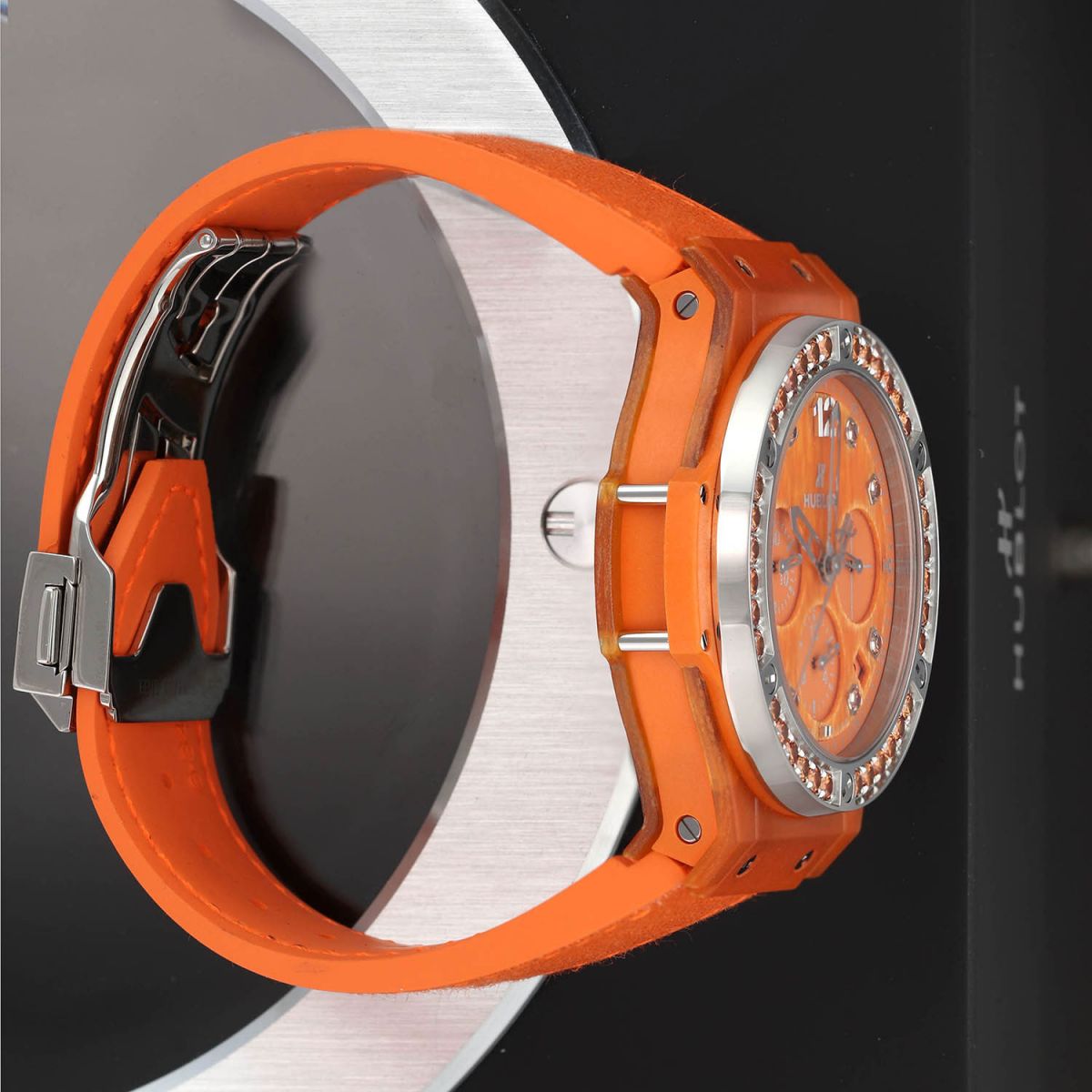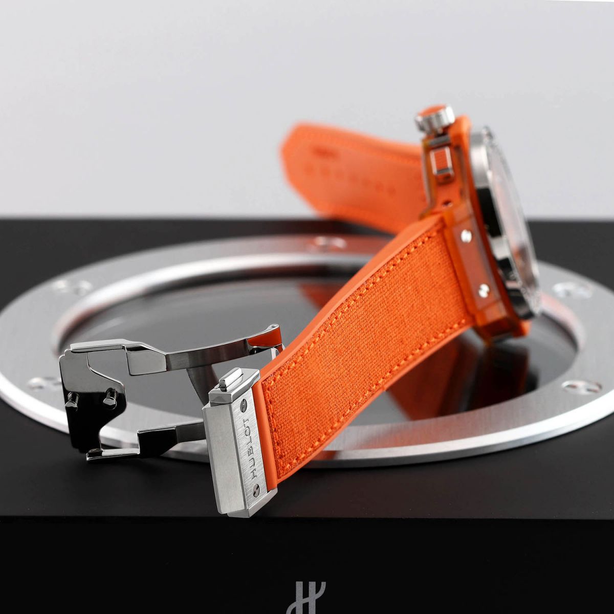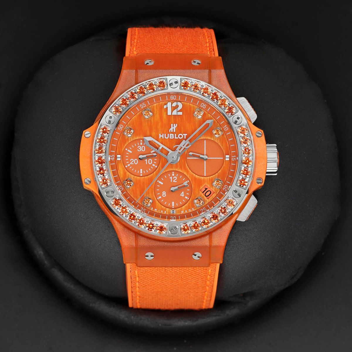 Case: Orange linen composite case. Polished stainless steel crown and pushers with orange rubber inserts. Polished titanium bezel set with 36 round-cut orange sapphires. Orange composite resin lower bezel ring and lateral inserts. Orange linen dial with vertical brushed effect. Polished hands and applied hour markers—eight of which are set with orange sapphires. Fine printed minute/seconds track. Date window between 4 and 5 o’clock. Small seconds sub-dial at 3 o’clock.