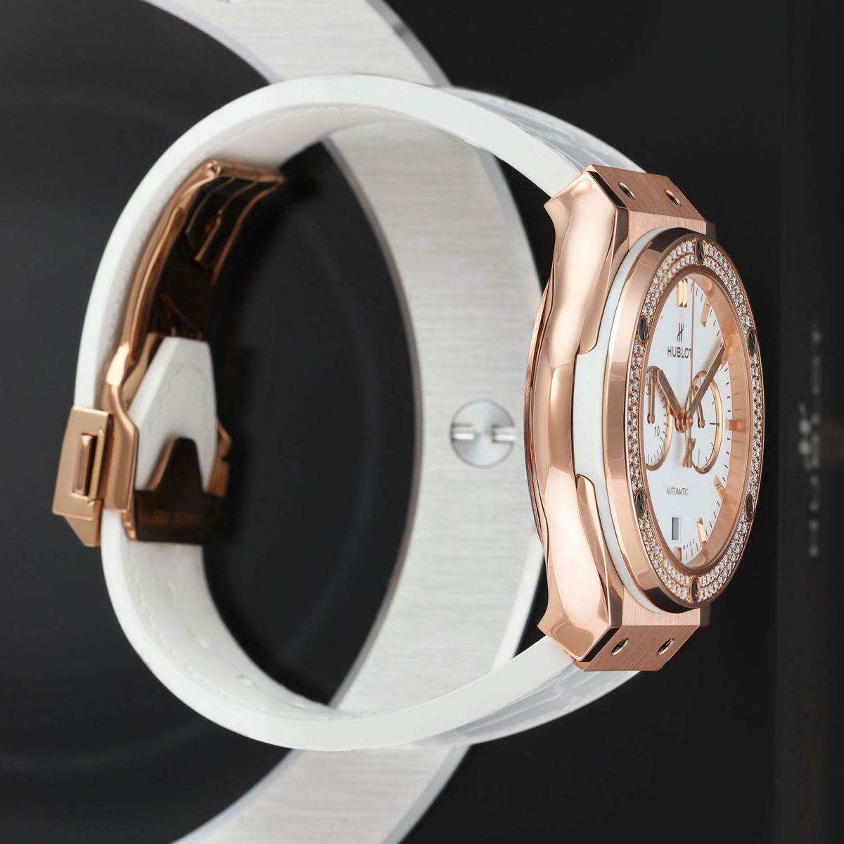 Strap: Fitted on its original Hublot white gummy-alligator strap (alligator leather top & rubber lining) with a push-button 18kt rose gold deployant buckle. The strap is brand new, crisp & unworn with its full wear lifespan remaining.