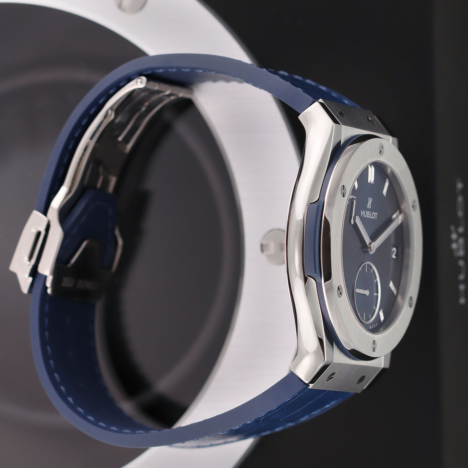 Strap: Fitted on its original Hublot blue gummy-alligator strap (alligator leather top & rubber lining) with a push-button deployant buckle. The strap is unworn with its full wear lifespan remaining.