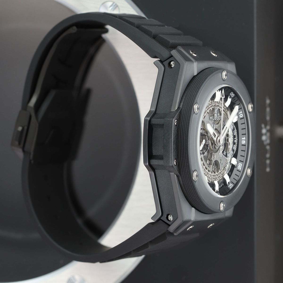 Strap: Fitted on its original Hublot black rubber strap with a matte black PVD coated titanium push-button deployant buckle. The strap is brand new & unworn with its full wear lifespan remaining.
