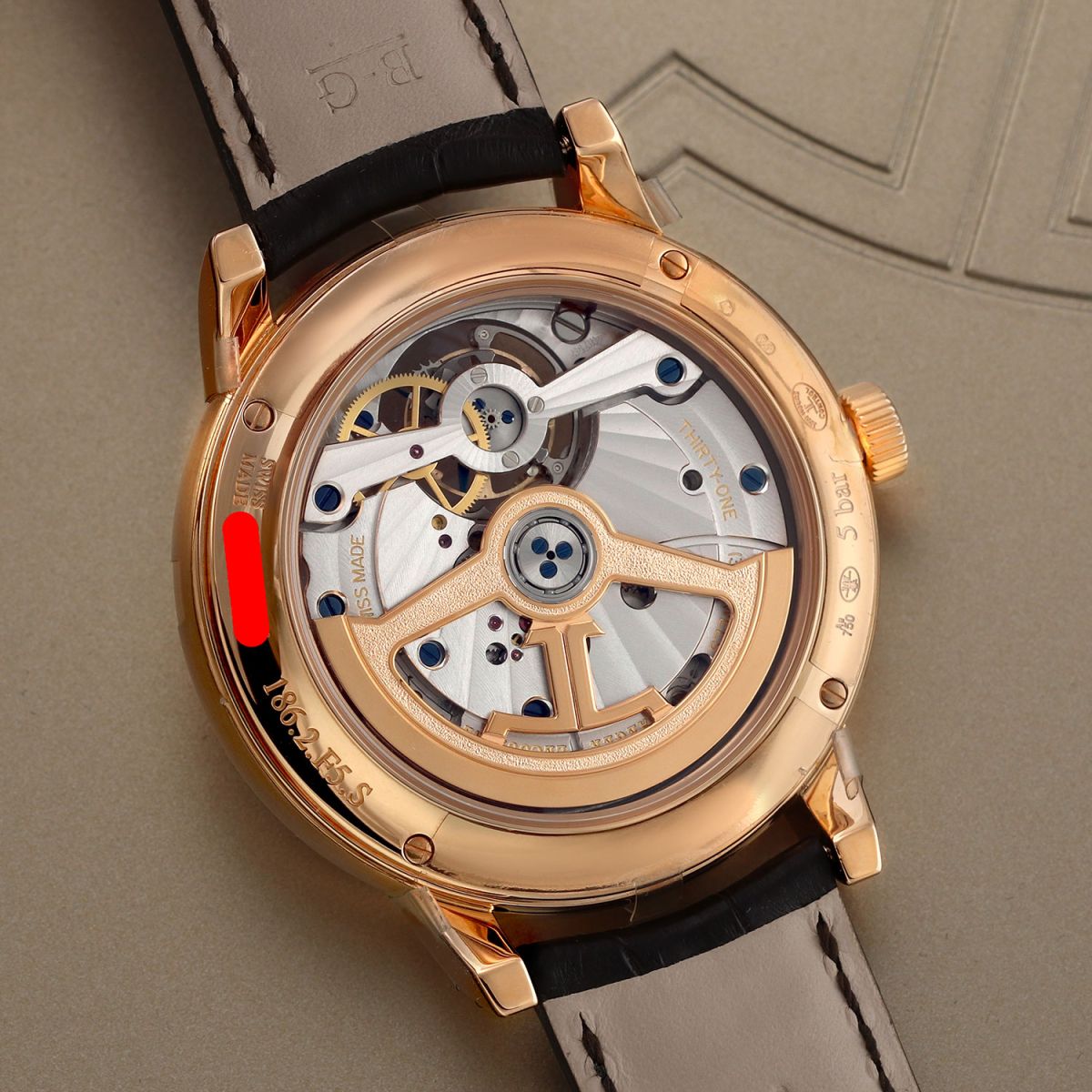 Movement: Powered by an in-house, selfwinding, Jaeger LeCoultre calibre 995, beats at 28,800 vph (4Hz), constructed of 275 parts, contains 31 jewels & has a power reserve of +/- 45 hours. The movement is exquisitely finished with Geneva-style finishing radiating from the tourbillon axis, and solid 22kt rose gold skeletonized rotor with multiple finishes.
