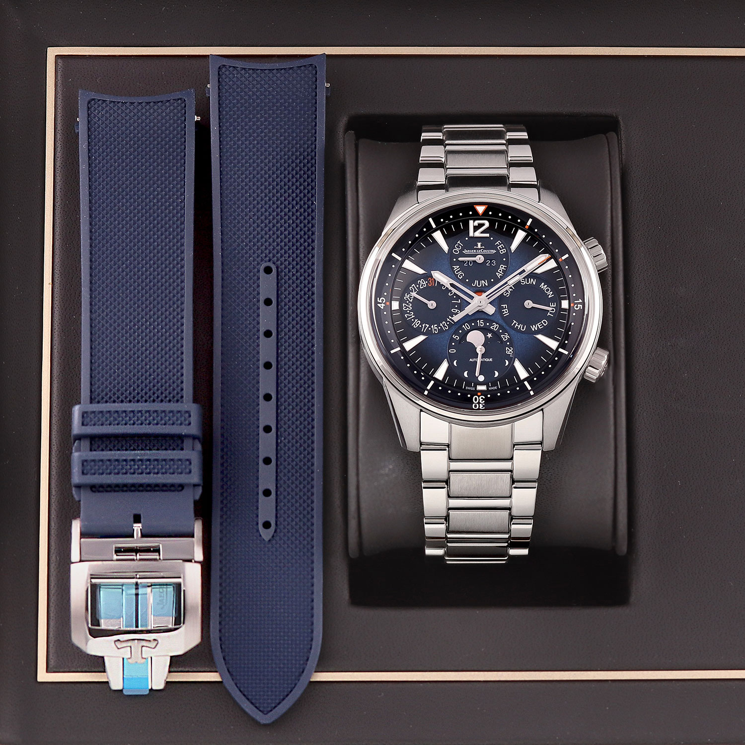 - Delivered with an addition JLC original blue rubber strap with a stainless steel deployant buckle. The strap is unworn, in new condition, with its full wear lifespan remaining.