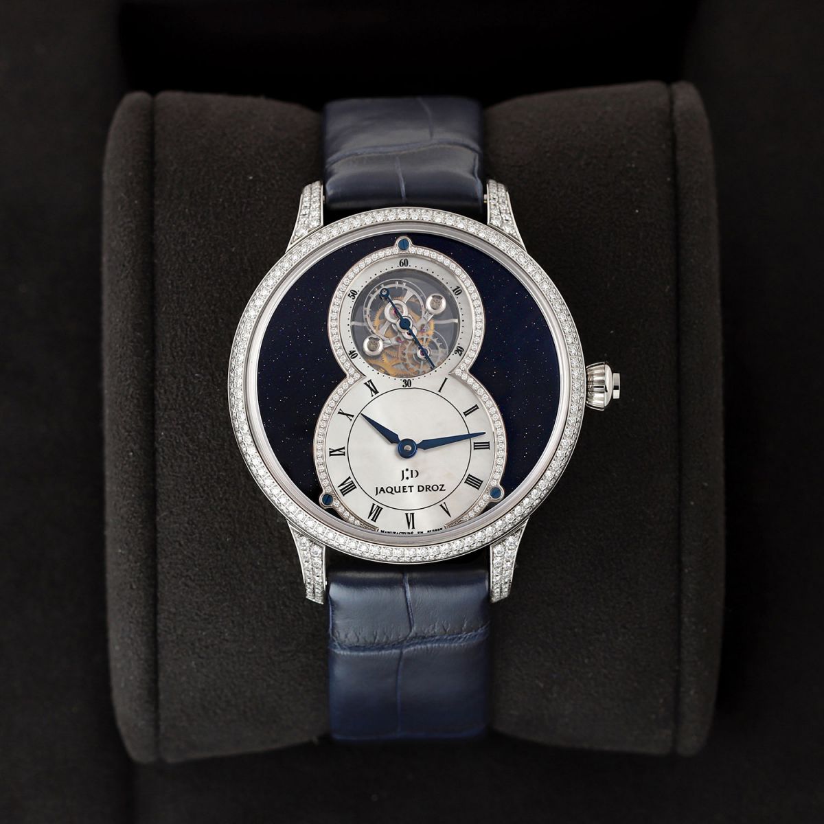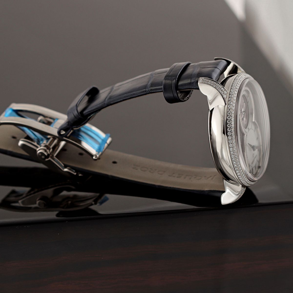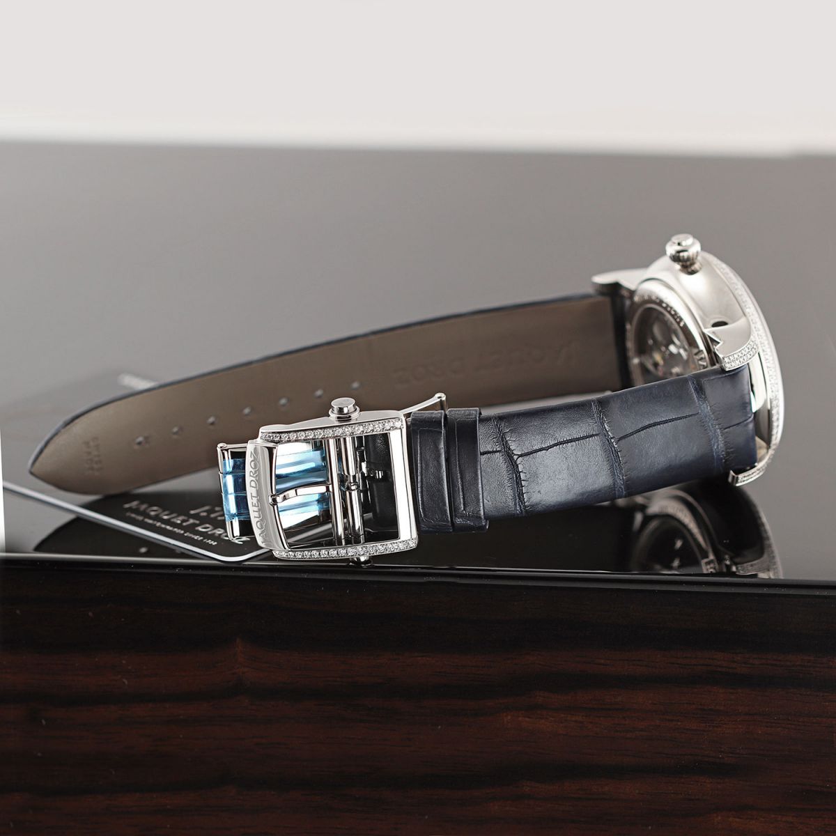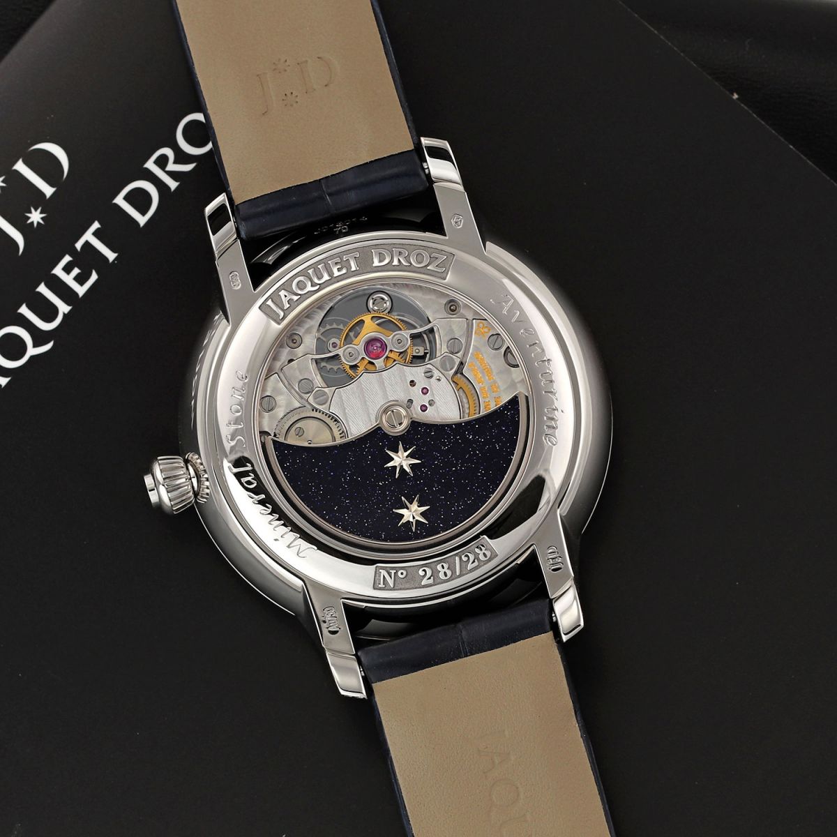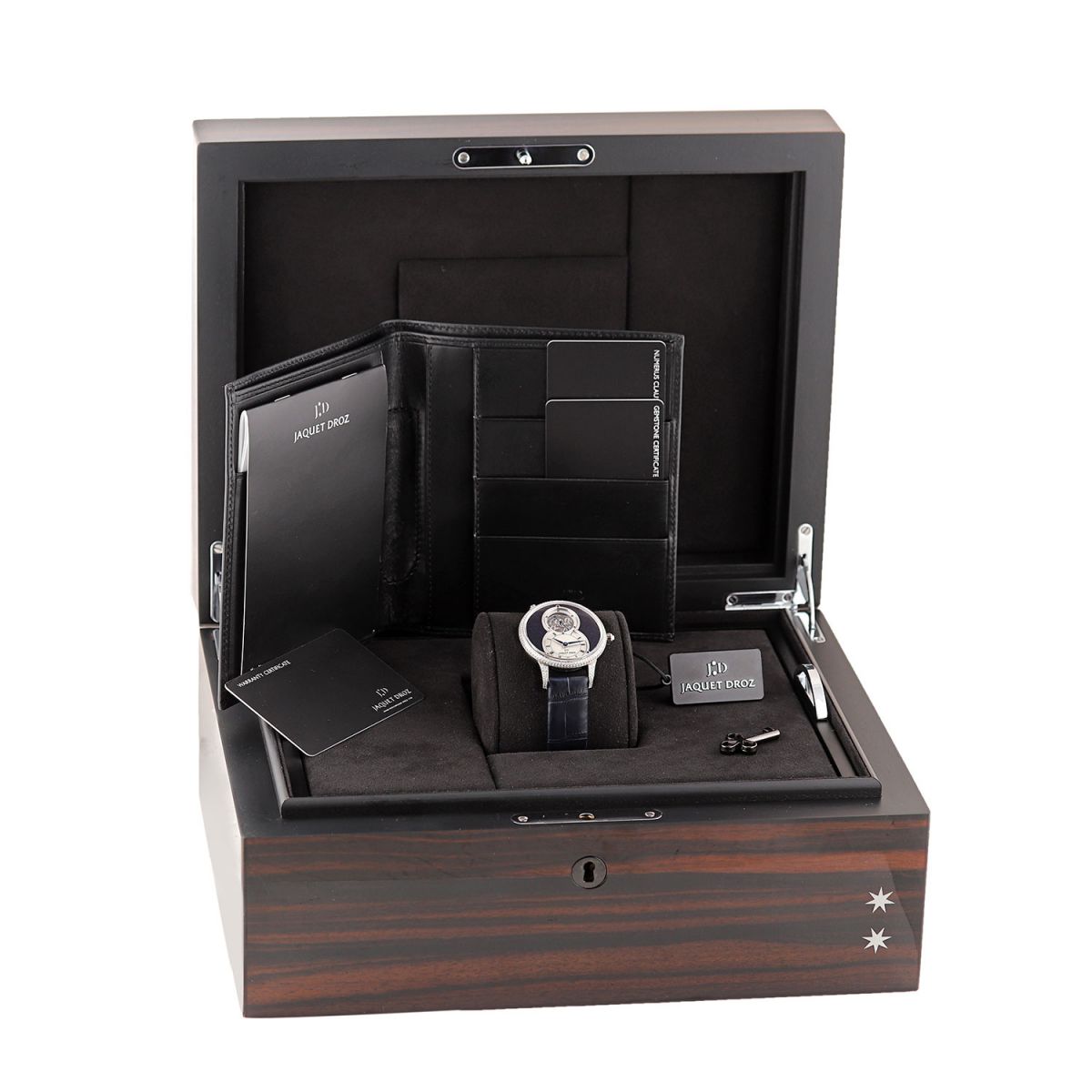 Strap: Fitted on its Jaquet Droz blue alligator rolled-edge (no stitching) strap with a solid white gold deployant clasp. The buckle is factory set with 32 brilliant cut diamonds weighing a total of +/- 0.27 carats.