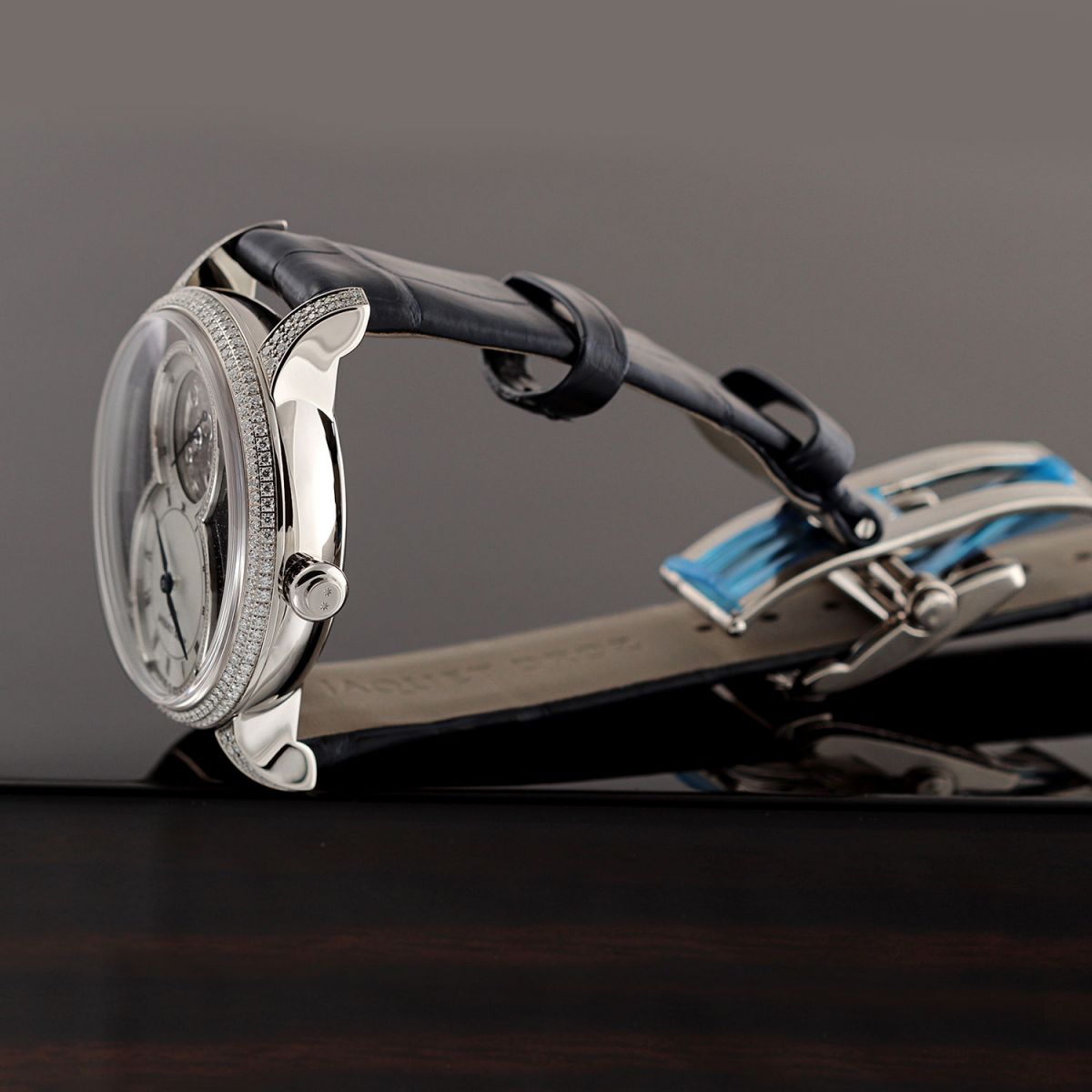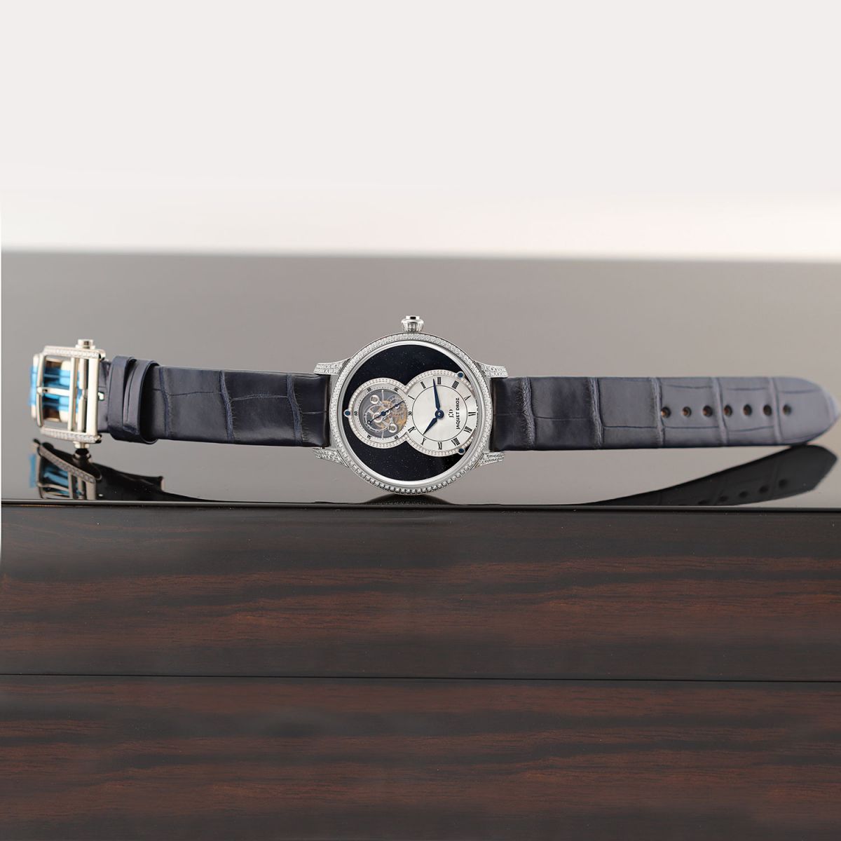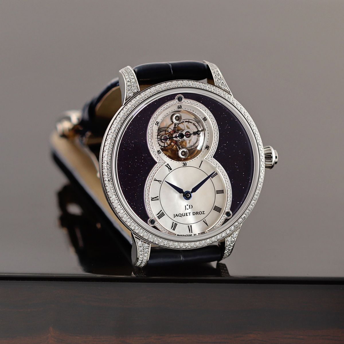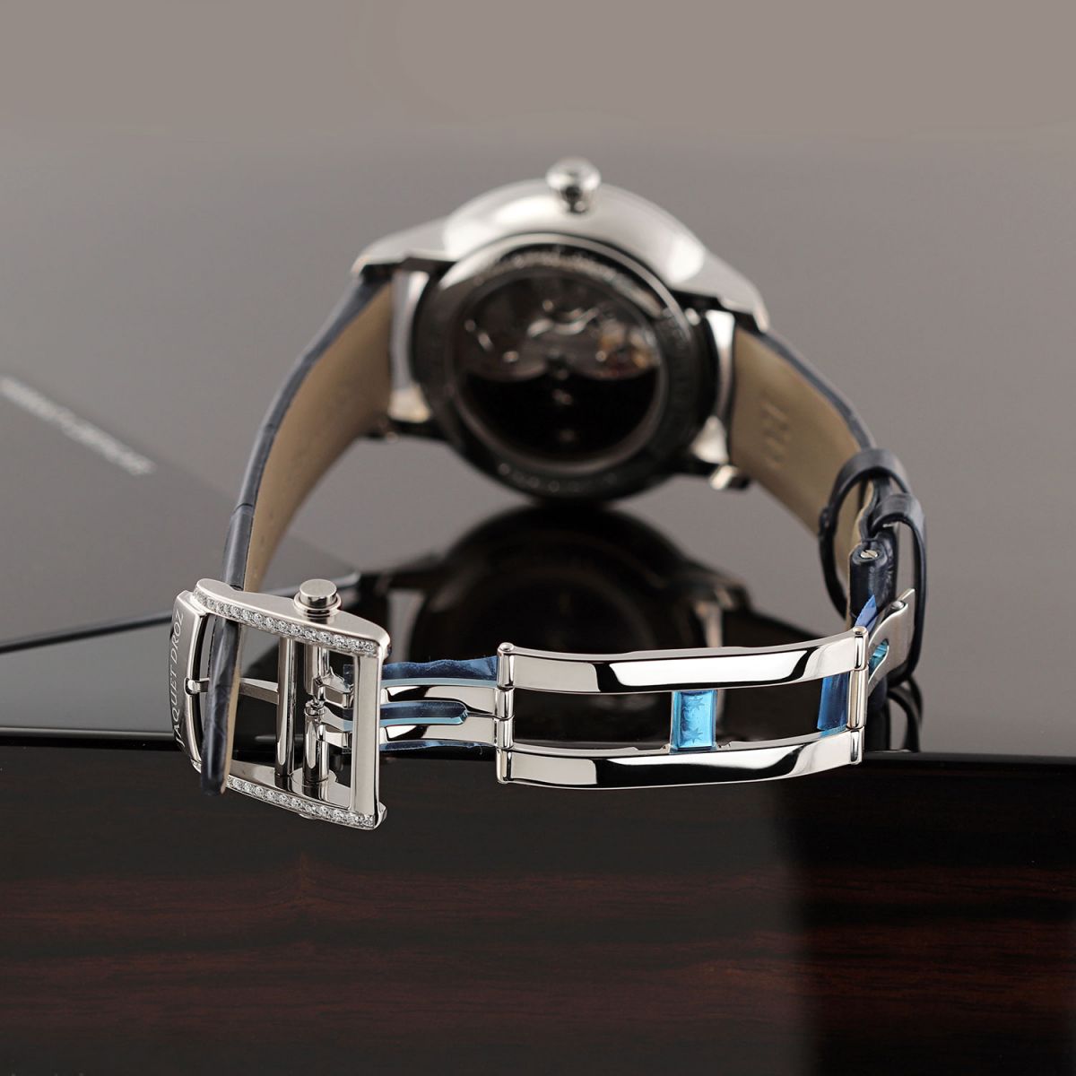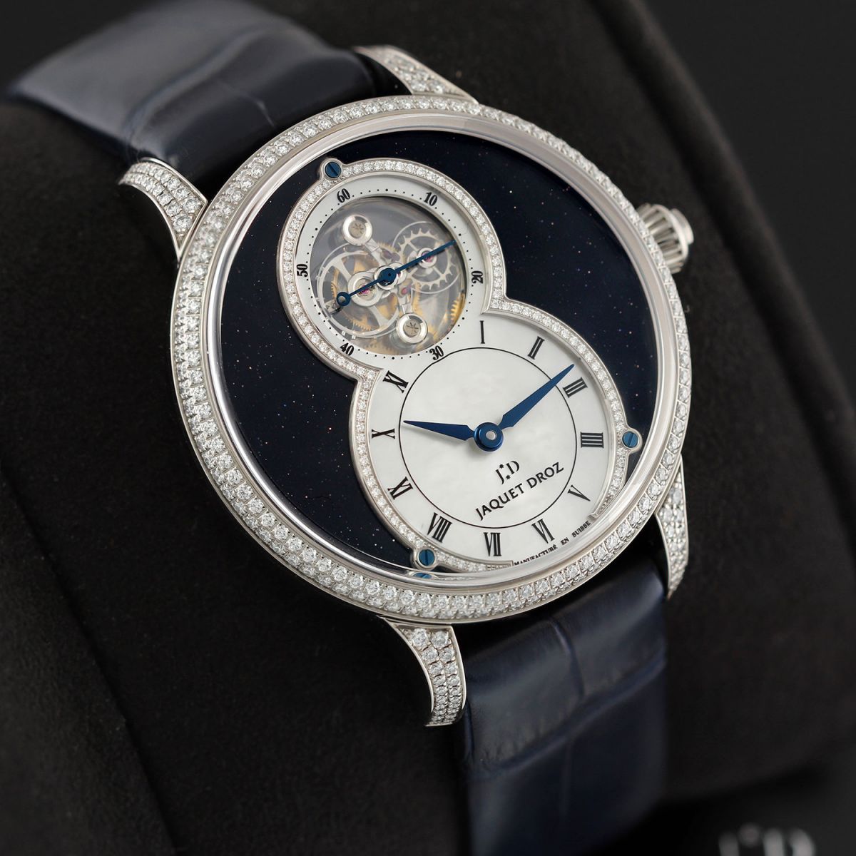 Strap: Fitted on its Jaquet Droz blue alligator rolled-edge (no stitching) strap with a solid white gold deployant clasp. The buckle is factory set with 32 brilliant cut diamonds weighing a total of +/- 0.27 carats.