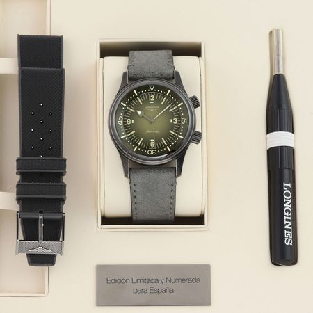 - Delivered with an additional original Longines black rubber strap with a stainless steel tang buckle. The strap is in excellent near-new condition with its full wear life-span remaining. We would rate this strap in 99%+ condition.