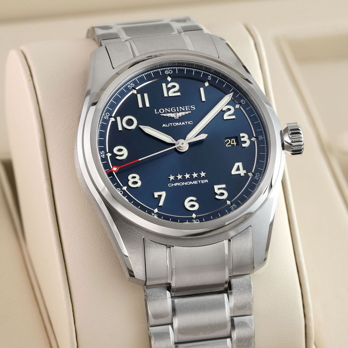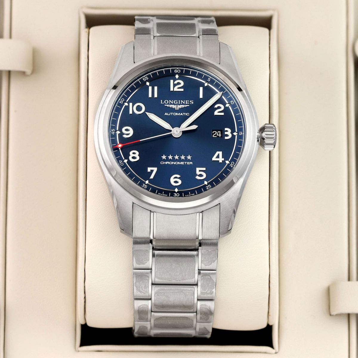 Movement: Powered by a COSC certified Longines caliber L888.4 (base ETA A31.L11), features a silicon balance spring, beats at 25,200 vph (3.5Hz), contains 21 jewels & has a power reserve of +/- 72 hours.