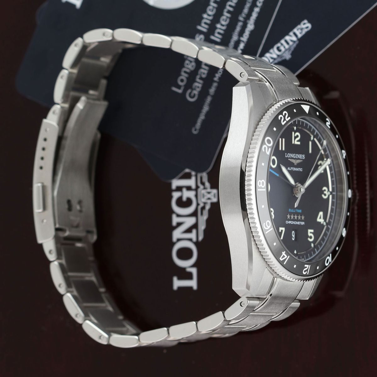 Case: Brushed stainless steel case with polished beveled corners. Bi-directional rotating GMT bezel with a polished black ceramic insert featuring a 24 hour scale & with a luminous starting triangle. Black dial. Polished hands with luminous fill. Applied polished numeral hour markers with luminous fill. Luminous diamond shaped hour markers. Dial flange with fine printed minutes/seconds & fractions of a second track. Date window at 6 o'clock.