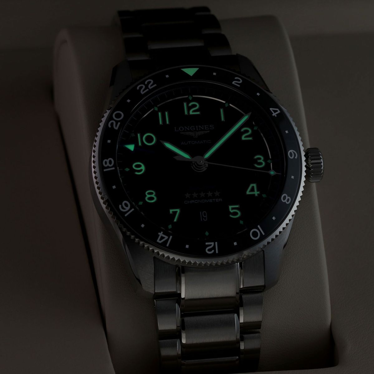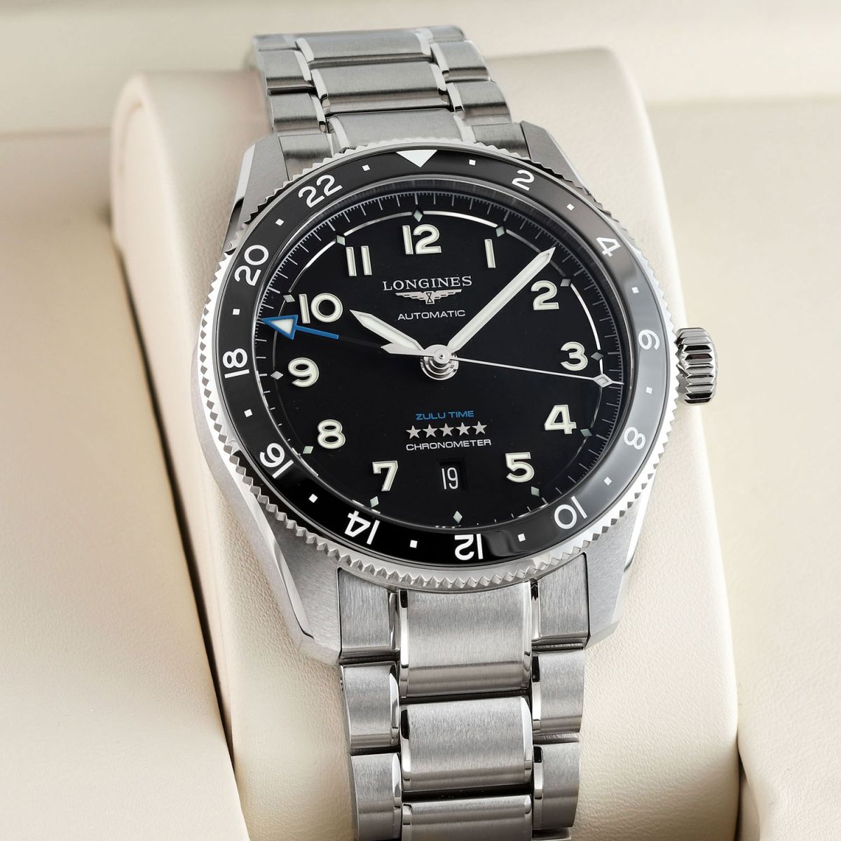 - GMT/Dual Time zone is indicated by the black & blue luminous filled arrow-head hand pointing to the 24 hour indications on the bezel.