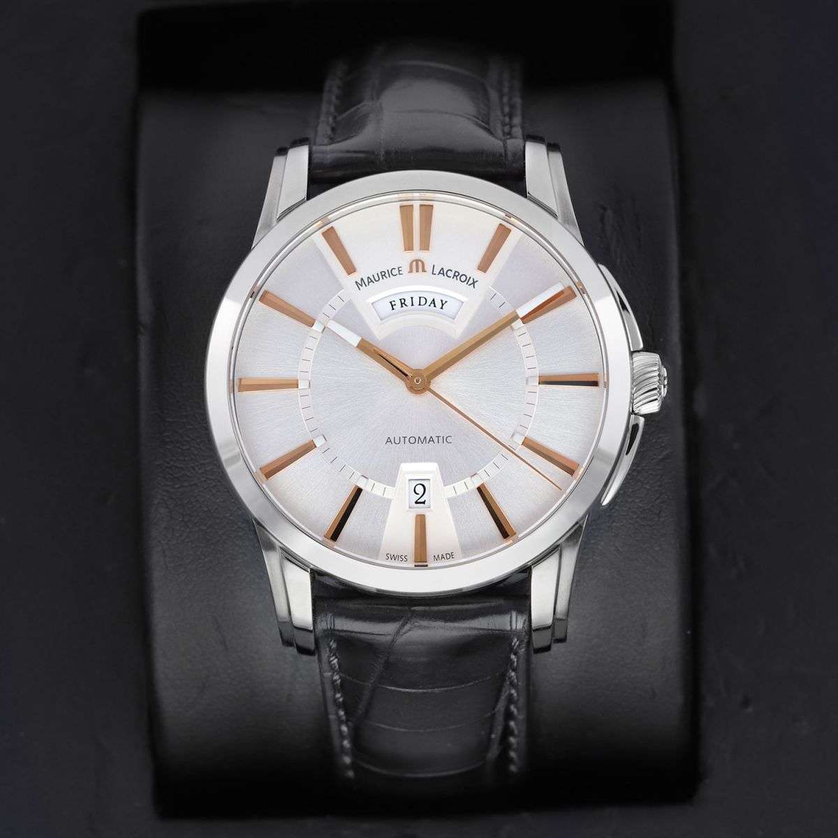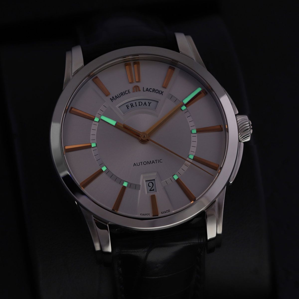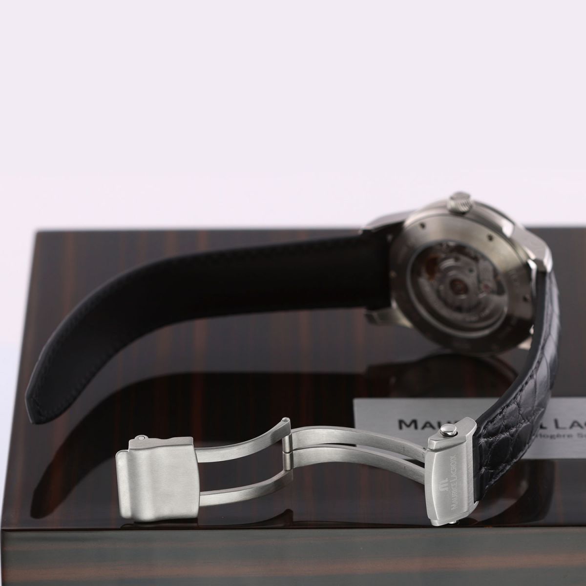 Strap: Fitted with its original Maurice Lacroix black calfskin strap with alligator print & a stainless steel deployant buckle. The strap is unworn and still crisp with full life remaining.