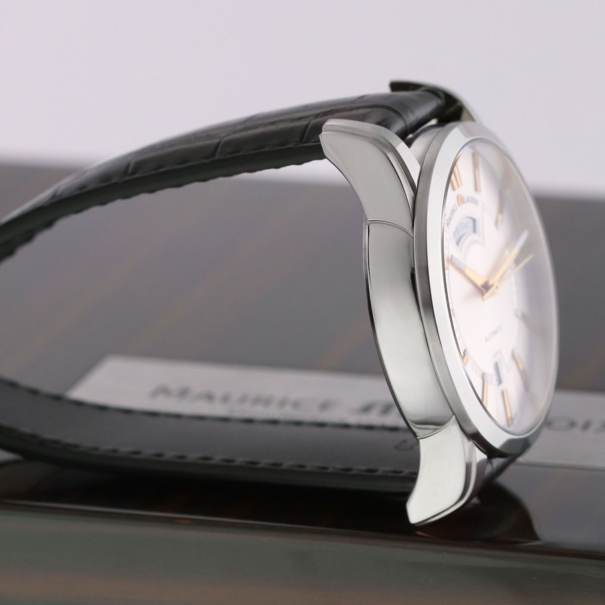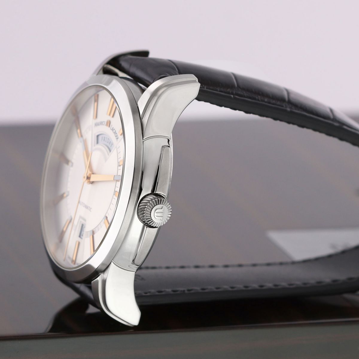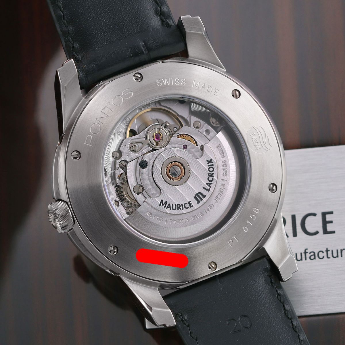 Movement: Powered by a Maurice Lacroix caliber ML009 (base ETA 2836-2), beats at 28,800 vph )4Hz), with 25 jewels, and has power reserve of +/- 38 hours.