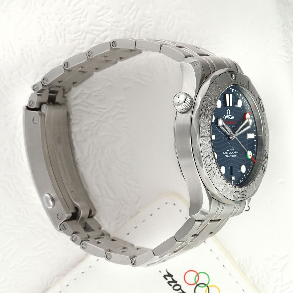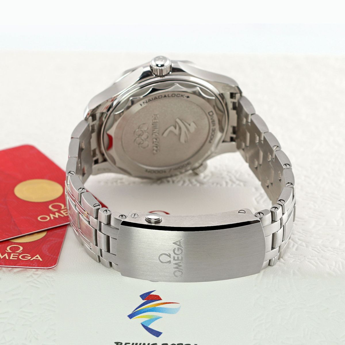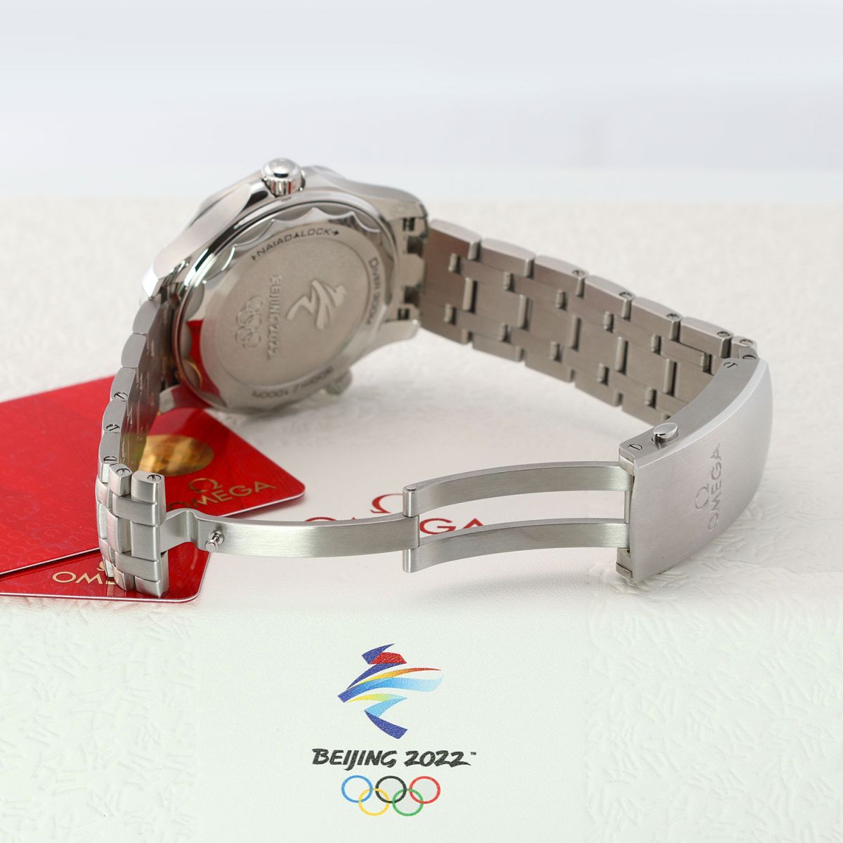 Olympic Winter Games Beijing 2022 special edition. Features a grade-5 titanium bezel & solid case back with an embossed Beijing 2022 Olympics logo. The dial features black (12), red (2), green (4), yellow (8) & blue (10) hour markers, the colors of the Olympic Rings. Delivered in a special presentation box.