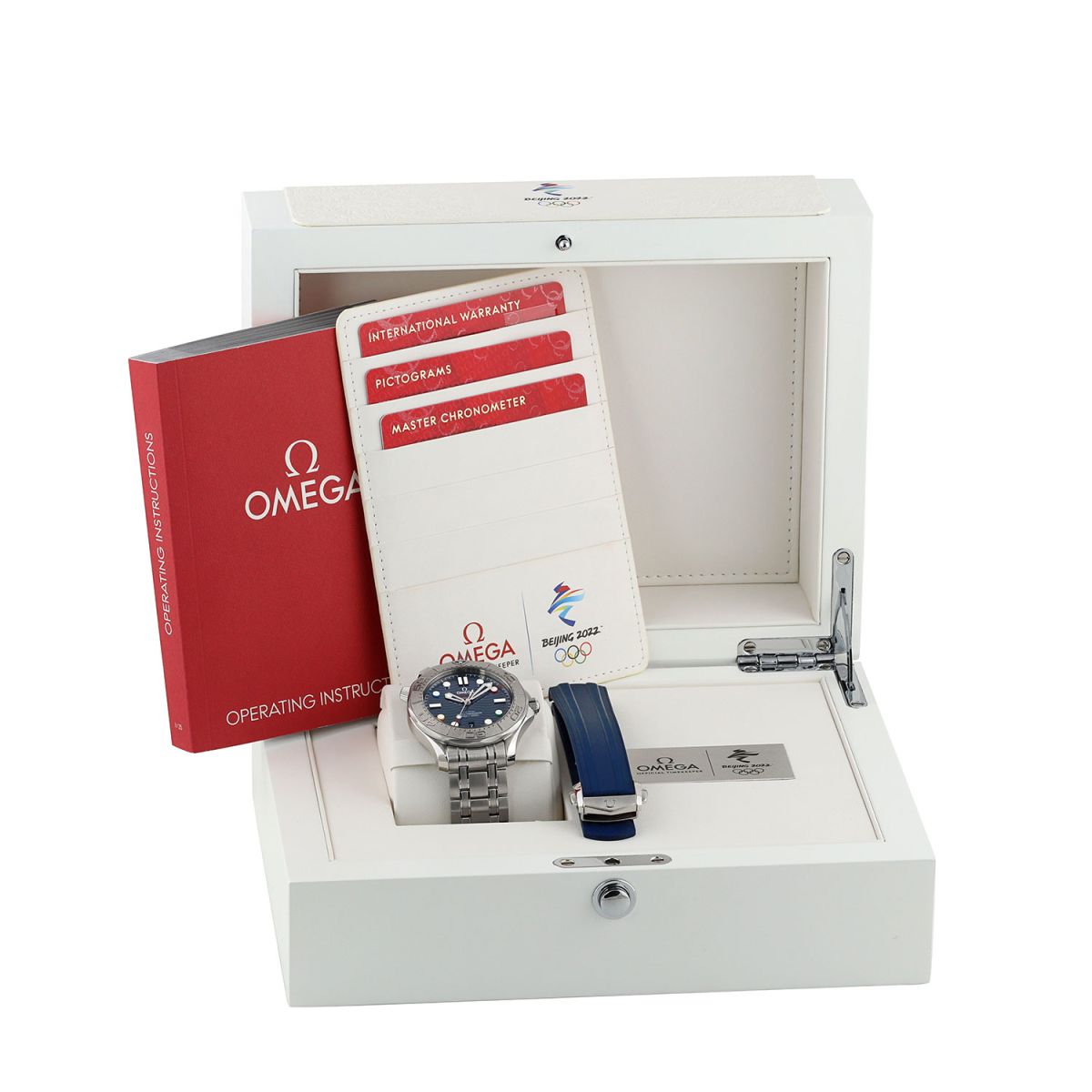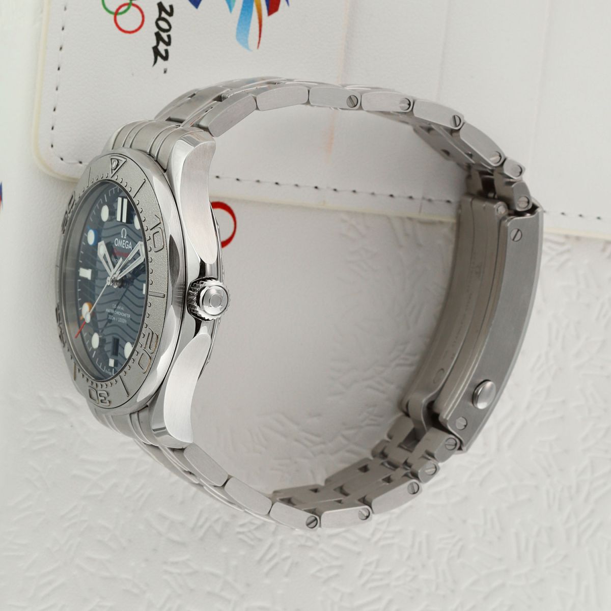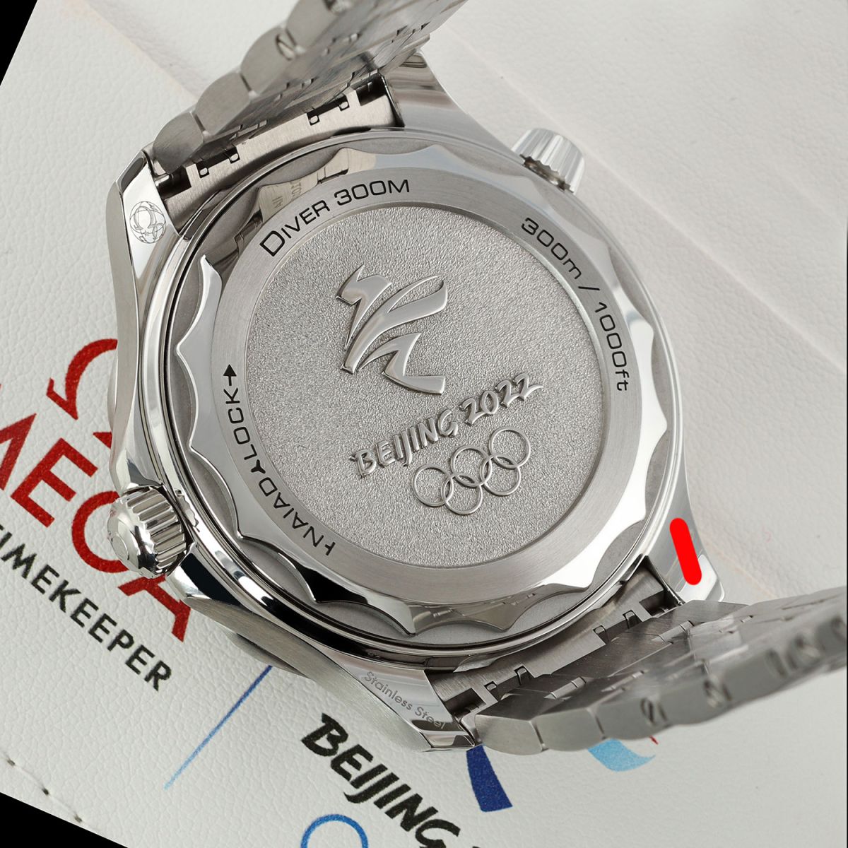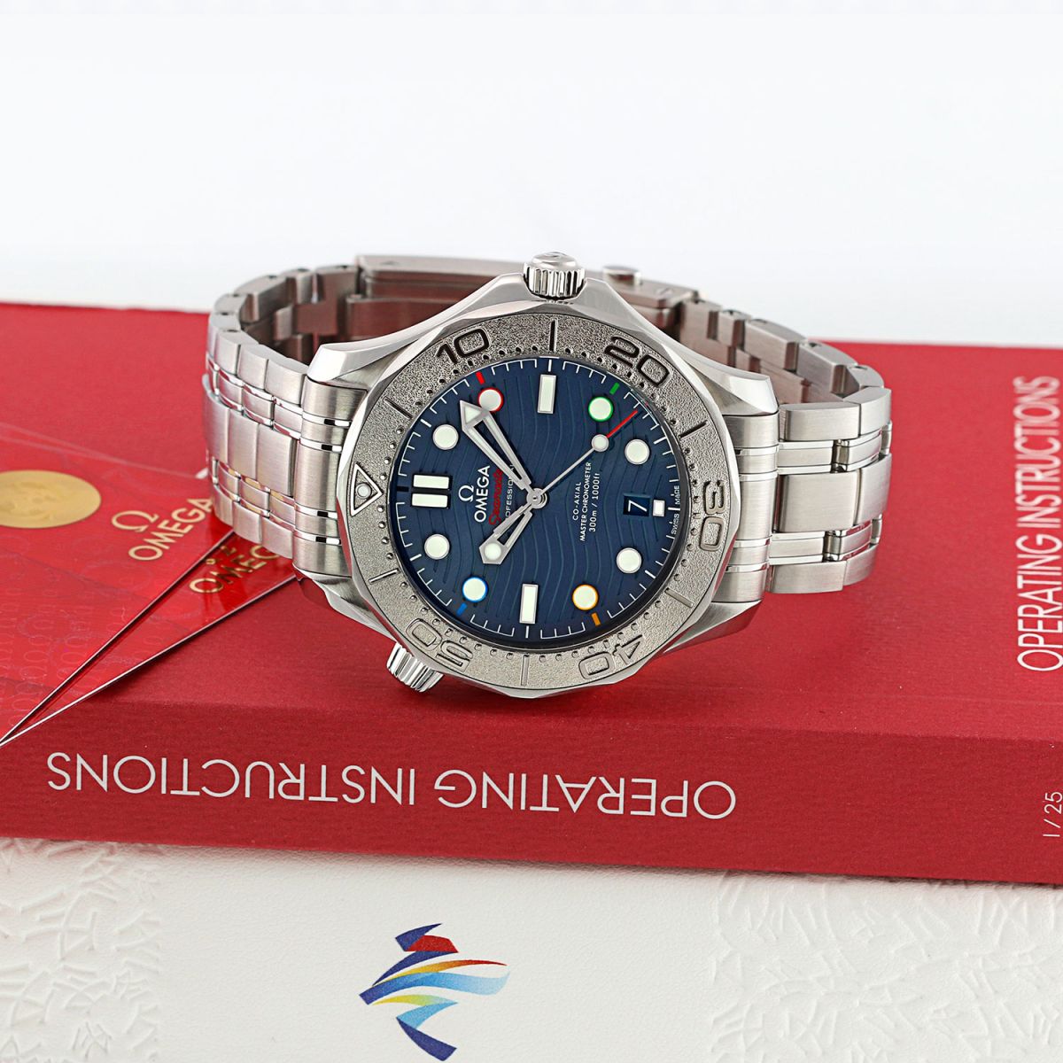 Olympic Winter Games Beijing 2022 special edition. Features a grade-5 titanium bezel & solid case back with an embossed Beijing 2022 Olympics logo. The dial features black (12), red (2), green (4), yellow (8) & blue (10) hour markers, the colors of the Olympic Rings. Delivered in a special presentation box.