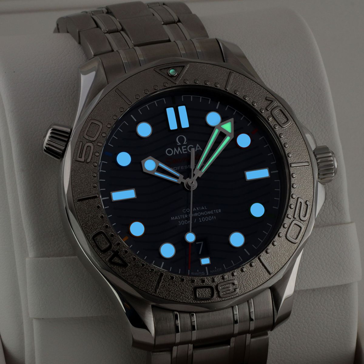 Case: Brushed stainless steel case with polished beveled corners. Grade-5 titanium bezel laser ablated with a fine grained finished, raised diving scale & a luminous dot at the starting point. Helium escape valve at 10 o'clock. Blue zirconium oxide [ZrO2] ceramic dial with a laser engraved wave design. Polished hour & minute hands. Red central seconds hand. Hands with luminous fill. Applied polished hour markers with luminous fill. Fine printed minute/seconds track. Date window at 6 o'clock.