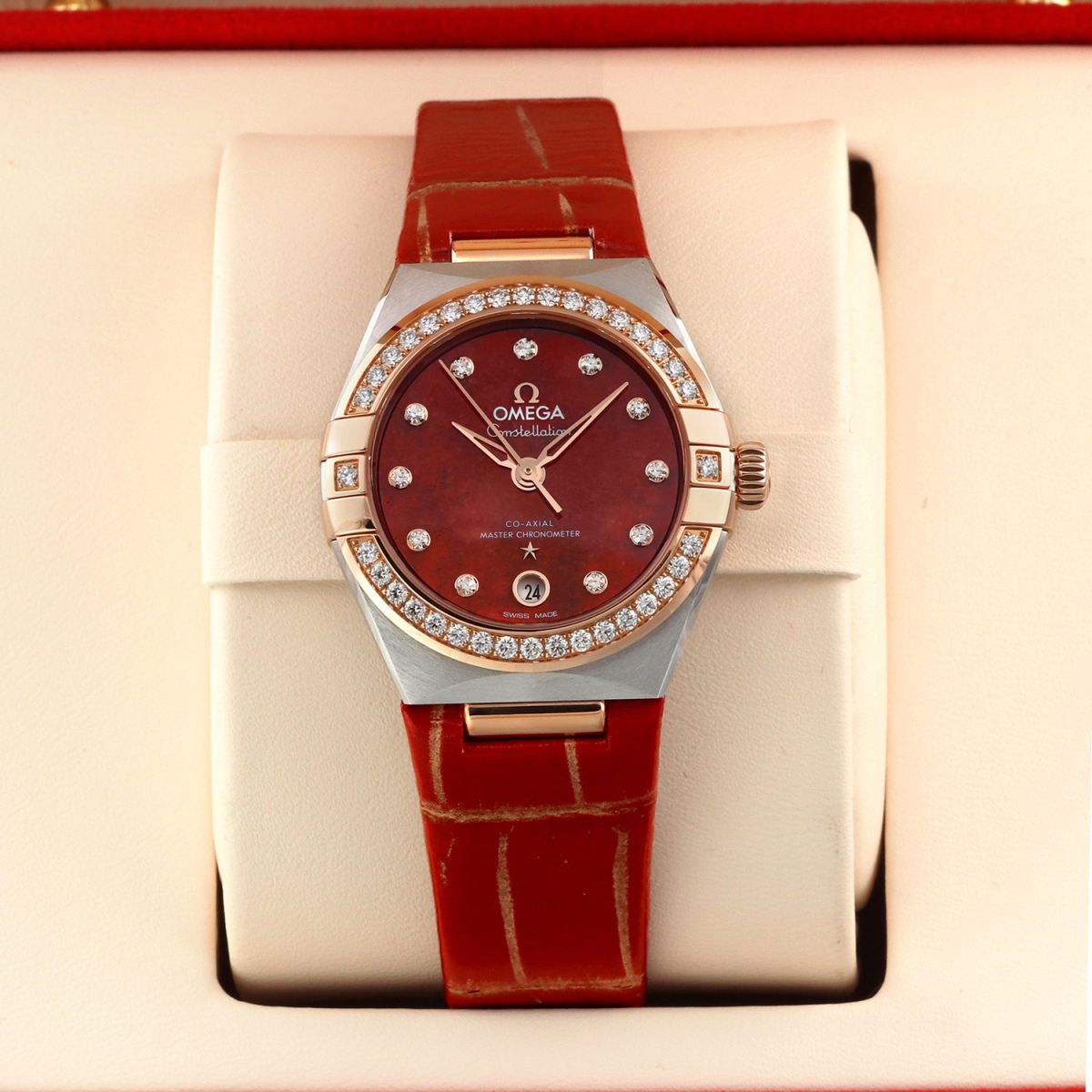 Case: Brushed & polished stainless steel case with a solid 18kt Sedna (rose) gold bezel, crown & strap lugs. Bezel set with diamonds. Natural red aventurine stone dial. Sedna gold hands. Applied Sedna gold hour markers set with diamonds. Date window at 6 o'clock.
