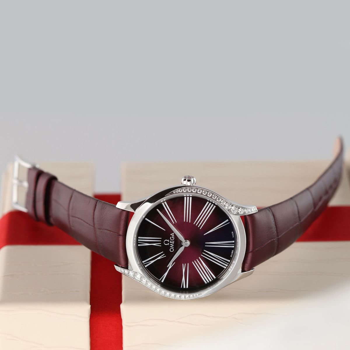Case: Polished stainless steel case. The crown features a red HyCeram floral design & is set with a single diamond. Lacquered gradient burgundy dial. Polished hands. Printed silver colored Roman Numeral hour markers. Mirrored case back with a unique 'Time For Her' engraved pattern.
