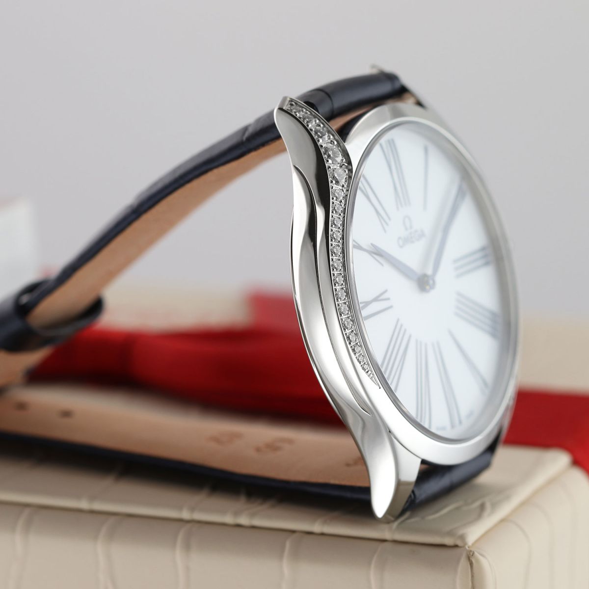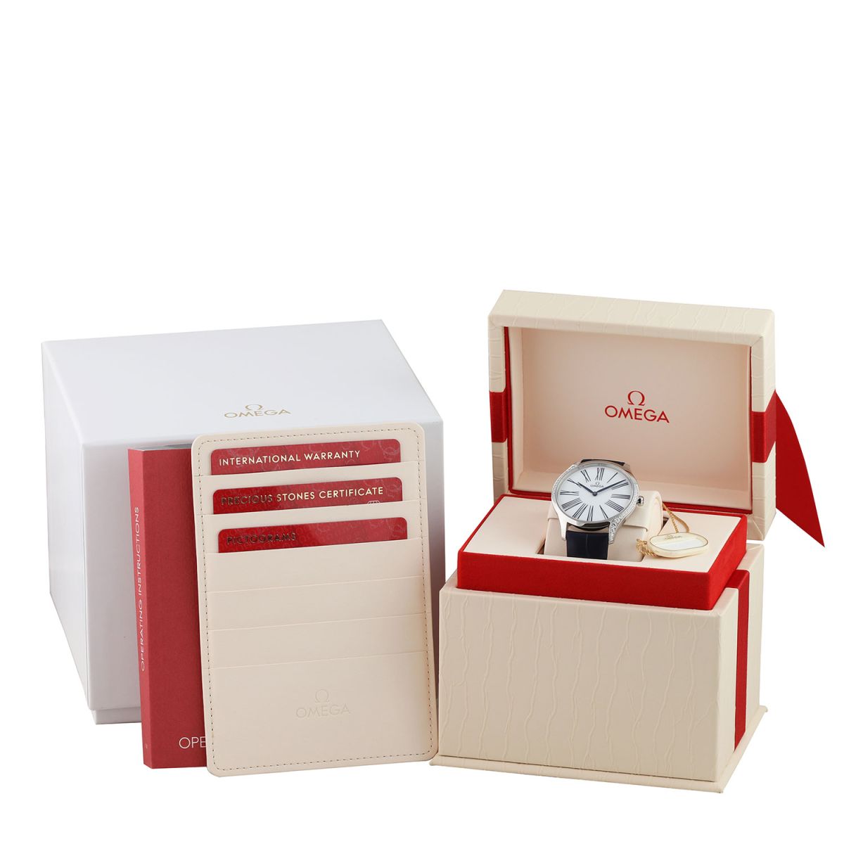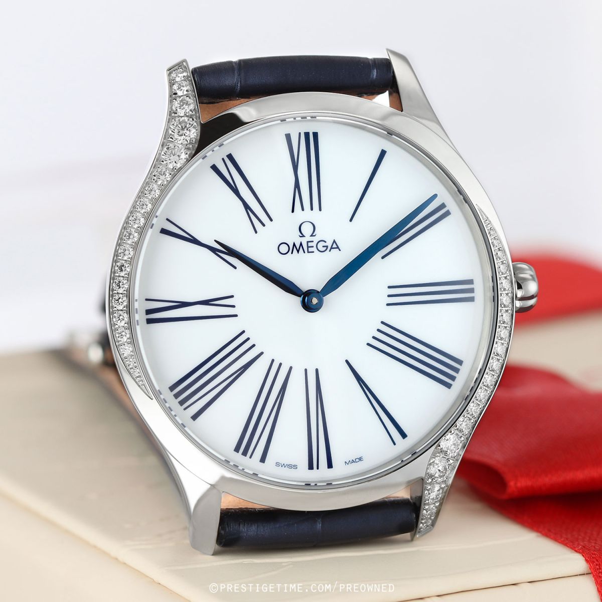 Case: Polished stainless steel case. The crown features a red HyCeram floral design & is set with a single diamond. Lacquered flat white dial. Polished blued steel hands. Blue Roman numeral hour markers. Mirrored case back with a unique 'Her Time ' engraved pattern.