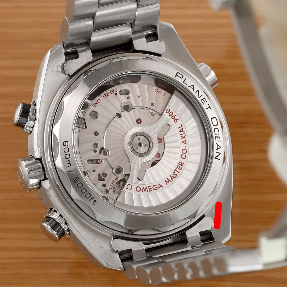 Movement: Powered by a self-winding METAS certified Omega caliber 9900, beats at 25,200 vph (3.5Hz), contains 54 jewels & has an approximate power reserve of 60 hours. The METAS certification tests water resistance, precision and magnetic resistance up to 15,000 gauss. The movement also features Omega's Si14 silicon balance spring and Omegas Co-Axial escapement. The rotor & visible bridges are decorated with Geneva waves in arabesque.